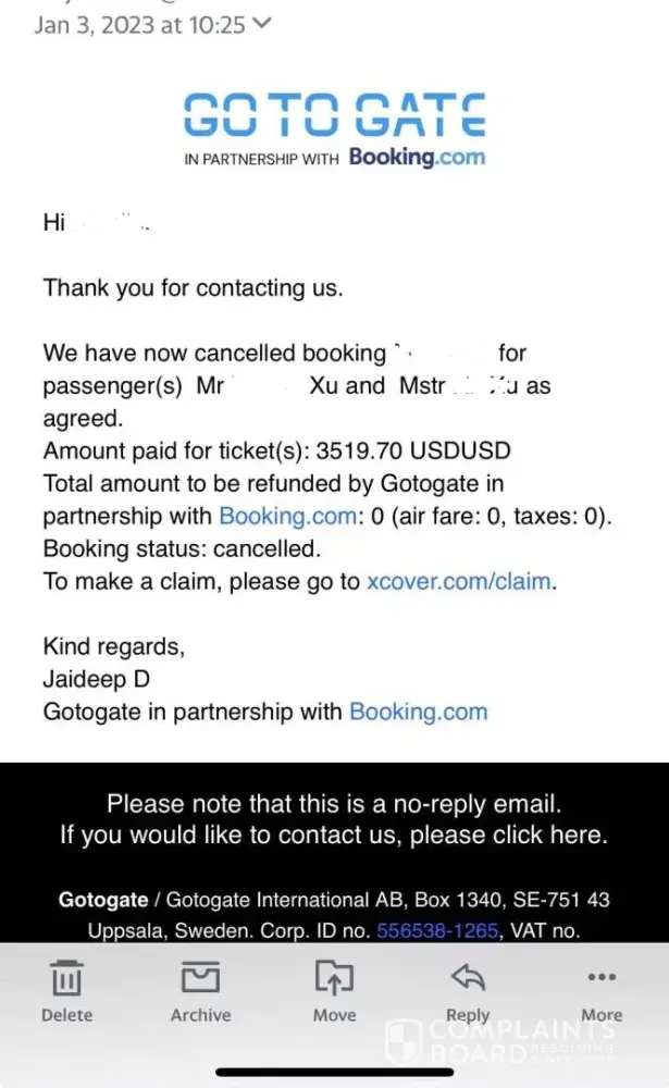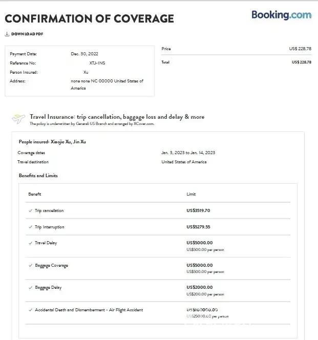 On December 30, 2022, I purchased travel insurance from Xcover.com through Booking.com for US$228.78 to cover two round-trip flight tickets. Due to the COVID-19 situation in Asia, we had to reschedule our flight reservation. We promptly informed Booking.com two days before the departure date, and their agent requested us to cancel the original flight and...