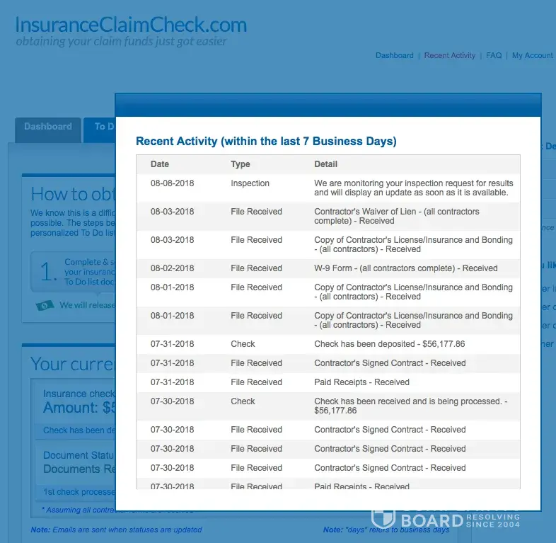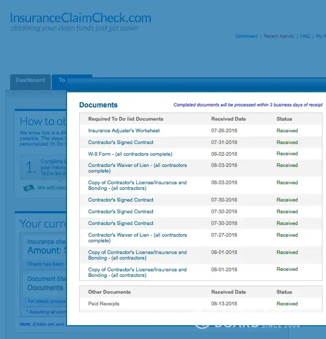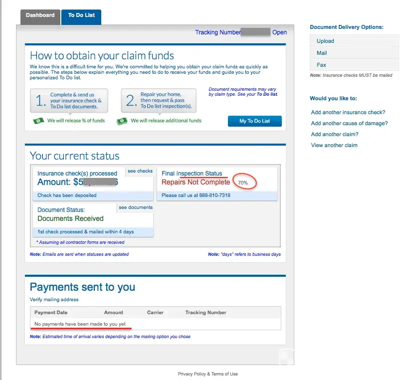 Instead, they set up an inspection to confirm the expenses I paid for were completed. The independent inspector they sent came out twice and concluded at least 70% of the repairs were completed. ICC fiddled around with the reports "Review in Process" for nearly a week before they started processing the first check disbursement check for only one of the many items already completed... During which time I upload more paid receipts, photos of more items being completed, and written letters requesting reimbursements, at least up to the 70% of the insurance claim settlement check I sent them. Nada, Zilch!