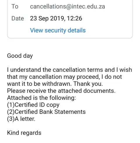 I, Malinda Gentle, student no [protected], informed Intec College via email on 11 September 2020 that I am cancelling my enrolled course, Certificate AutoCAD Level 4 [protected] and demand a full refund for the course fees. Until to date I have received no response, feedback or confirmation of receiving this email. I had to contact them again on 18 September 2020 to confirm they received my email. It was explained to me that the procedure for deregistration takes 2-3 working weeks for reviewing and consideration, before the outcome will be send via email and a 90 days waiting period for refund to be done if any.