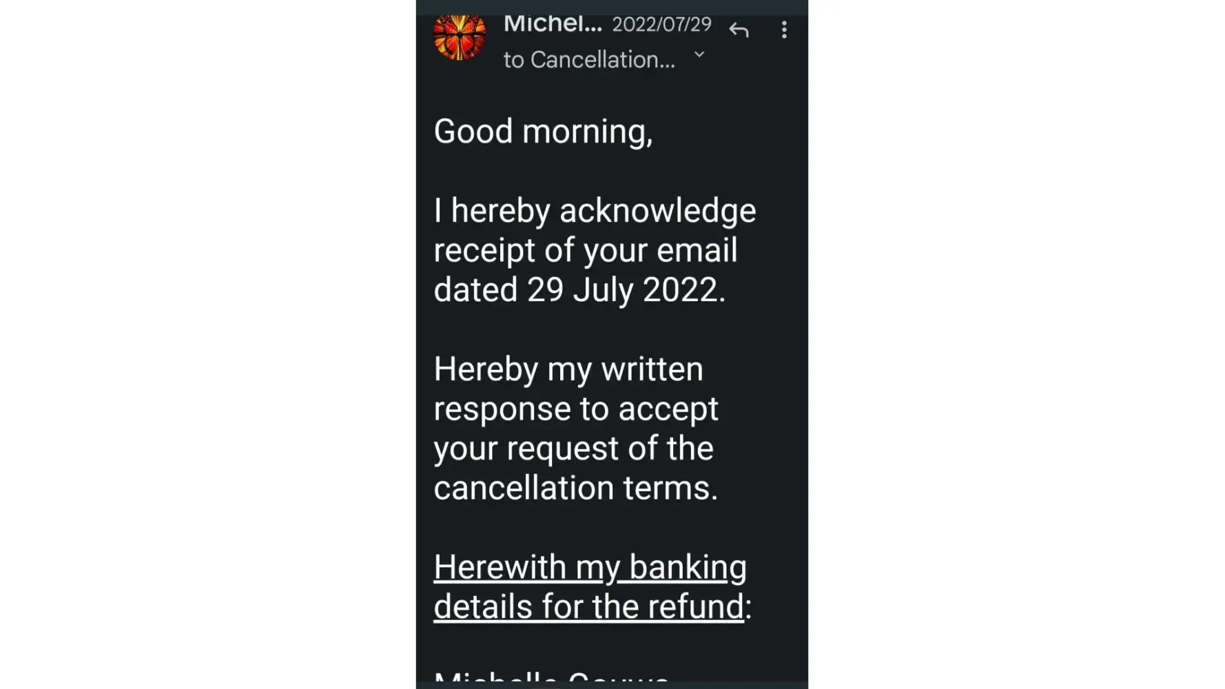 Desired outcome: Cancellation and refund
