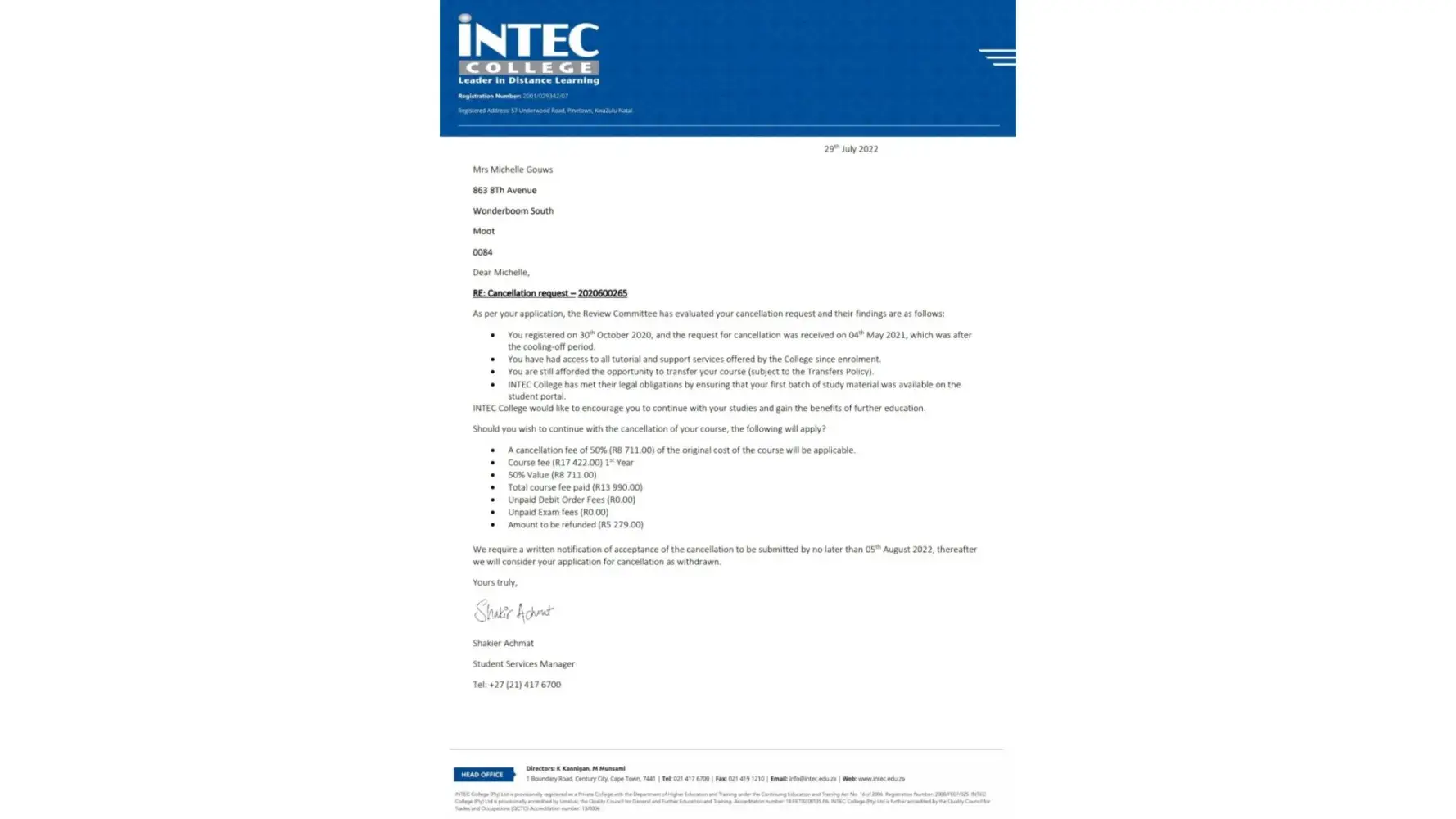 On 29 June 2022 Intec wrote me a letter to confirm that they owe me a refund of R5,279.00.