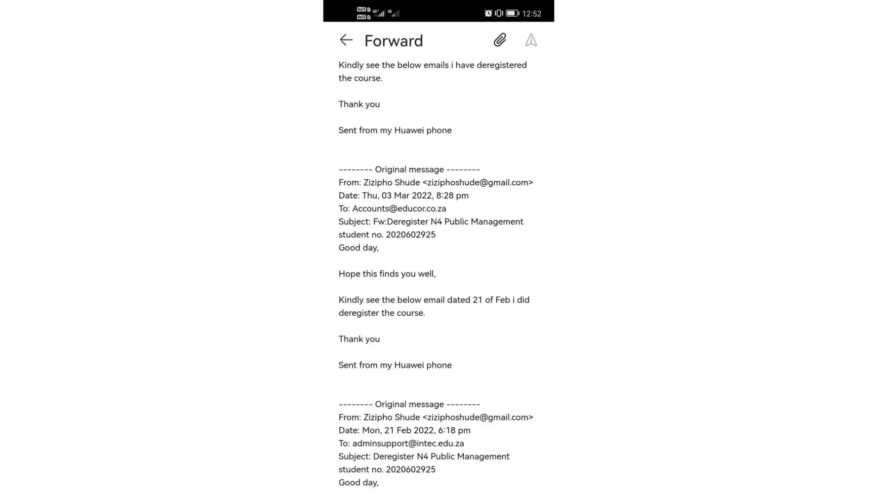 I have sent a De-Registration and email trails forms on the 10th of May 2022 to the student portal email address, of which I had already on numerous emails did this with the consultant that was assisting me with my registration process, by the name of Shubnum Mideen, the email sent where also addressed to Tanya Haripersad and support email, and still my emails have not been returned and nor the de-registration been done, and yet I am still being debited, I will continue to reverse these. you are affecting my credit score.