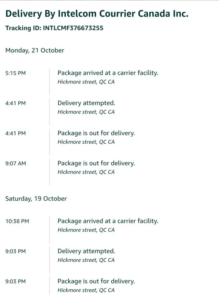 When I ordered my Amazon order it was expected to be delivered to Kamloops on November 21 and on the 22 it said it was delayed due to severe weather. Looking at the Intelcom tracking the package arrived in Kamloops on November 21 at 5 am and I can confirm the weather is beautiful in Kamloops on the 21st and 22nd, no snow or rain, just sunshine. What is going on?