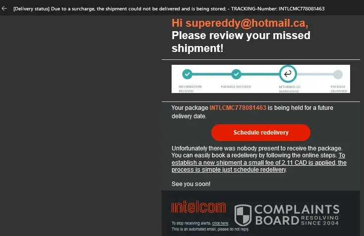 [Delivery status] Due to a surcharge, the shipment could not be delivered and is being stored; - TRACKING-Number: INTLCMC778081463