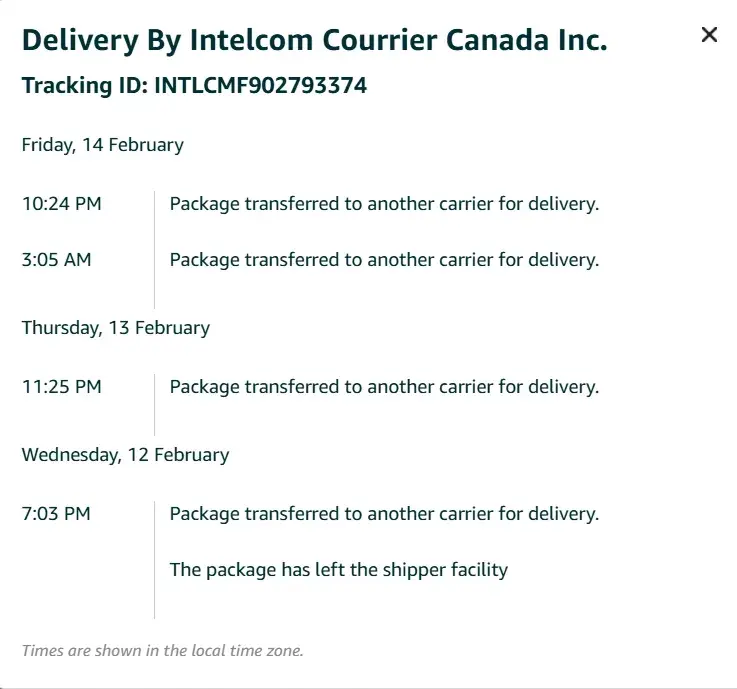 I ordered 5 books from Amazon. Delivery did not occur by the expected date, so I checked the Intelcom Courier website on Sept.12 for tracking information. Their tracking information stated: