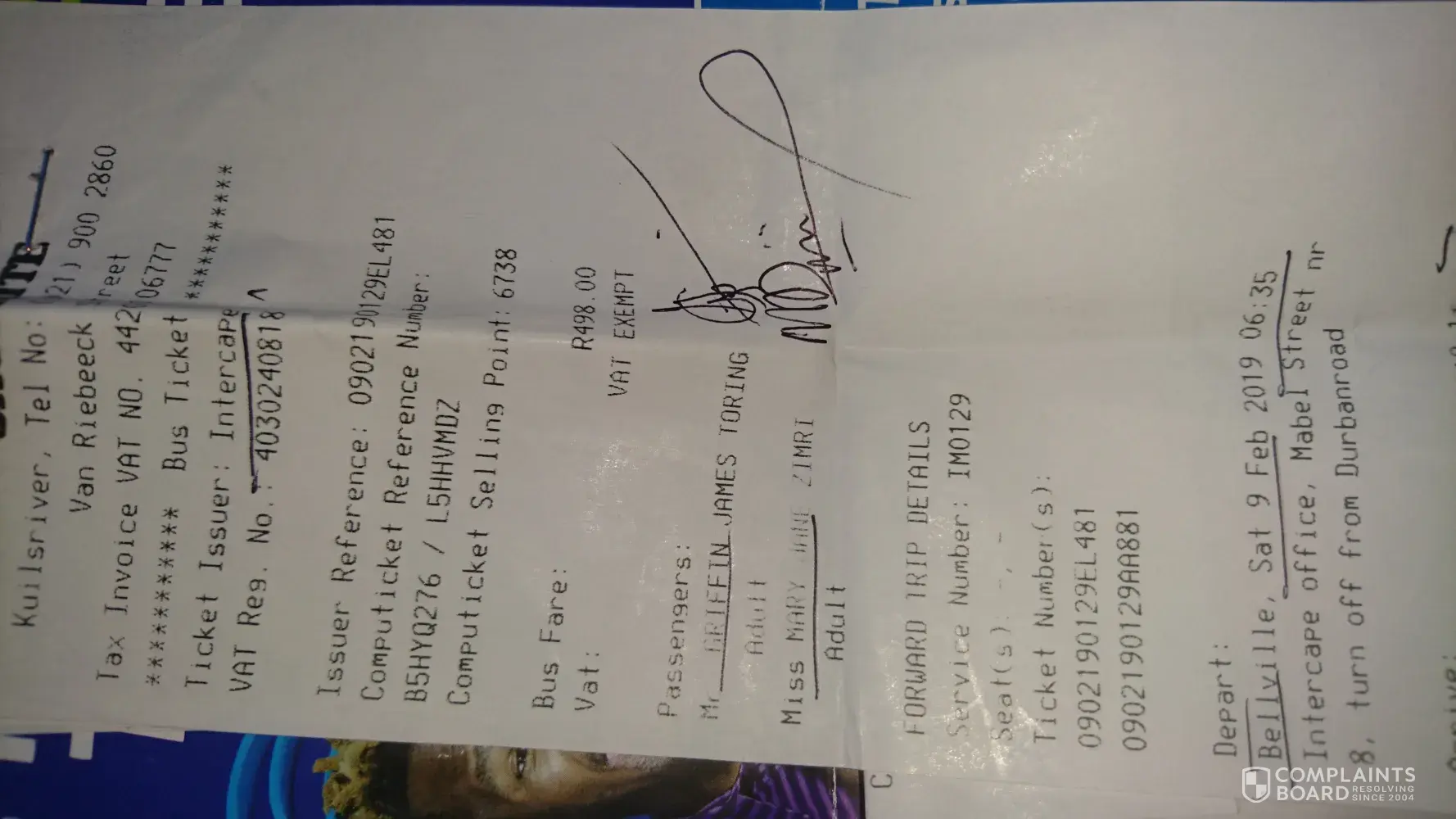 On Sat 9th of Feb 2019 at 5:50am, myself and my very good friend Mary Jane Zimri went to the intercape bus stop at Intercape office, Mabel street nr 8 for a 6:35am departure and 11:55am arrival in Mosselbay. This being our very first bus trip in our lives and with the trip getting us to Mosselbay for our best friends wedding at 4pm we were anxious and very nervous. So we got there and waited asking other bus patrons what we need to do, they instructing us to just wait in line. Also during this time no announcements were made and no Intercape staff visible. However as other Intercape busses pulled up we would proceed to ask the bus conductor and he would say its not our bus. Eventually we started making a loud commotion about the bus being late, at this time it was 6:44am. A patron who had just disembarked told us to go to the Intercape desk inside a building behind us. We get to the desk, the woman at the counter although sweet in nature could offer us no help. We then caught an Uber from the Belville station to the next stop which would be Shell garage in Somerset West with a 7:20am stop. We asked if she could not contact the driver and ask if he could just maybe wait a bit, or if there was anything she could do to help. She said that she could not. Anyway so we rushed thru to Shell Somerset West at full speed, on route I called help desk to find out if there was no way they could accomodate us. The woman on the phone was not helpful nor pleasant at all. Eventually at 7:26am we reached the Shell Somerset West stop to no avail. We had just missed the bus. We then found a Intercape van at the stop and asked him for anysort of help or even help to get new travelling arrangements as we were at a loss of what to do next. We were highly stressed and emotional and no one at Intercape seemed to care or want to help us. This has trully put a sour taste in our mouths and we were appalled at the insensitive way first time bus travellers were handled, especially on such a big day in our lives and that of our best friend and because no announcements were made or sign up to indicate that we need to first go to the Intercape desk. We ended up paying over R800 each to find alternate travelling arrangements, ontop of the initial and not used R249 for our Intercape bus ticket. I do hope that someone will get back to us regarding this issue.