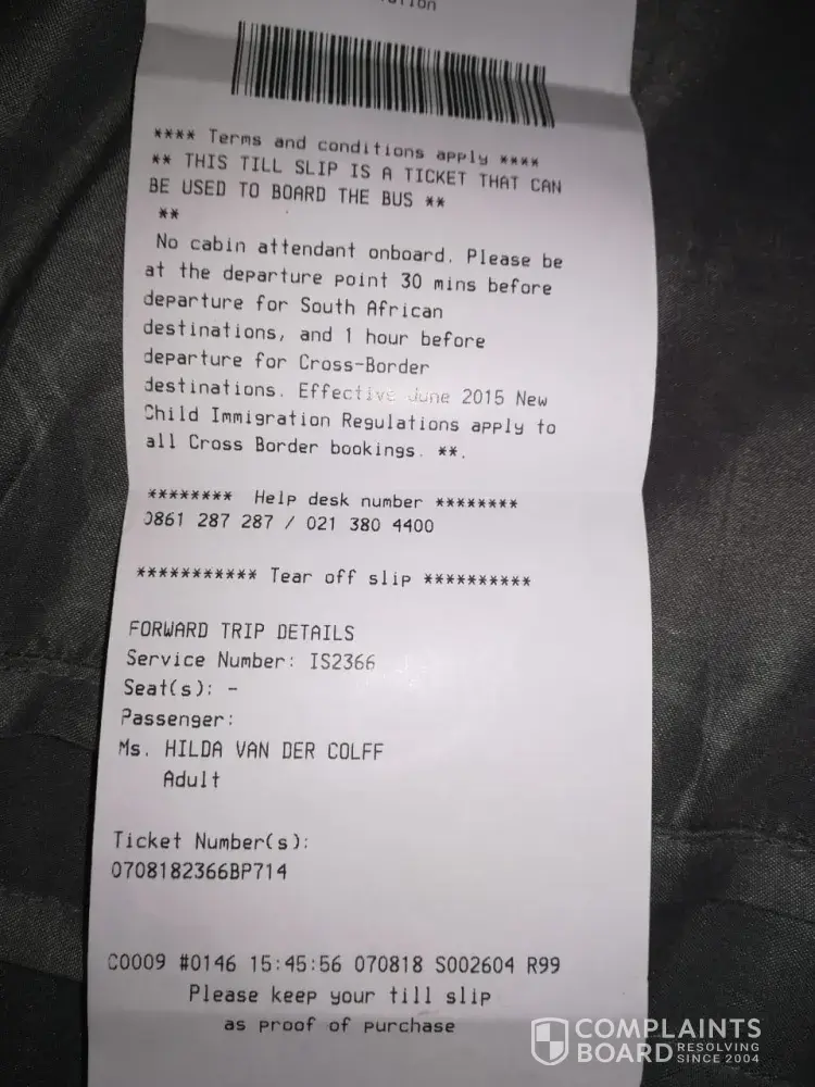 I would like to lodge a formal complaint to Intercape Bus services. I am writing for the attention of your customer experience team.