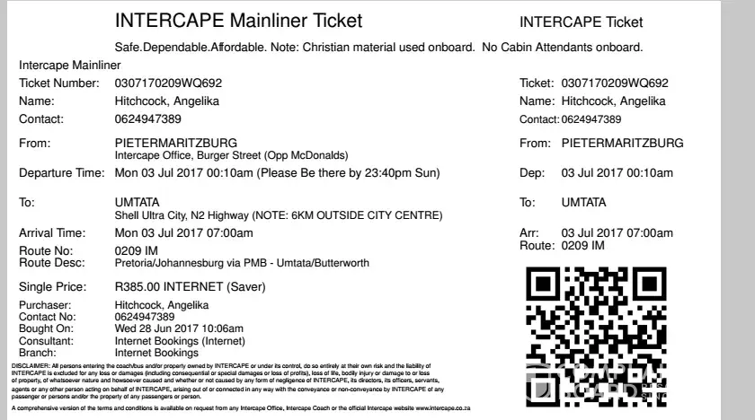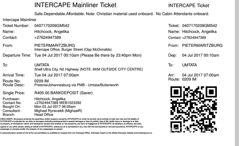 Attached you will see my trip 1- my initial booking, umtata to PMB, and back. And then trip 2, which could have been avoided. All fine and well that the bus was late, but no notification was sent! 45 mins before the departure timee I already left the place I stayed at, using a cab. We were only told 1 hr after departure time that the bus broke down and the arrival time cannot be confirmed, but would not be in the next 3 hours. By this time I was already late for work, and the time we would have arrived, everyone would be at work, and no one to fetch me.