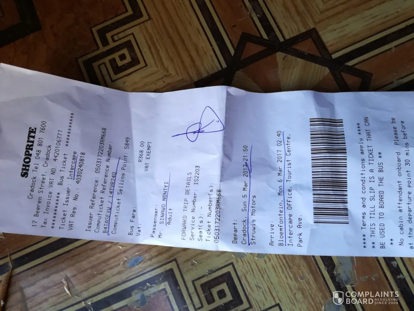 I made a booking on the 6th of December 2016 to take a bus from Cape Town to PE.