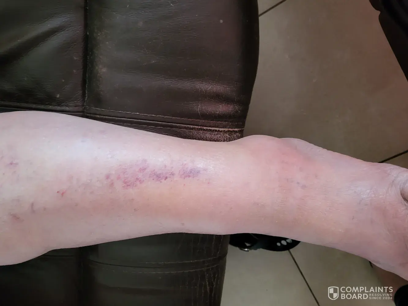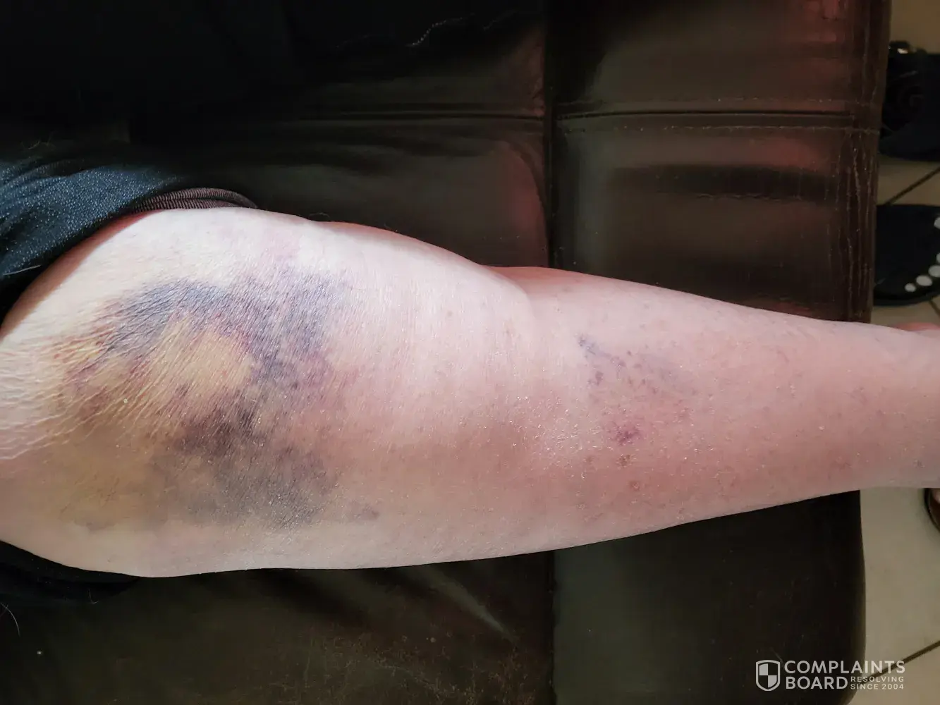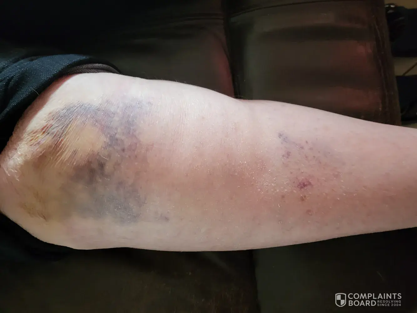 Absolutely no assistance was given and my mom was eventually helped by some fellow travelers. At the transfer point she tried to get into the shuttle bus, again without any assistance as non was provided, and she had a nasty fall. She was again assisted by fellow travelers who also had to pick her up from the floor as she could not get up. Please see attached photo's of her legs taken two weeks later when she returned via AIROPLANE from CT.