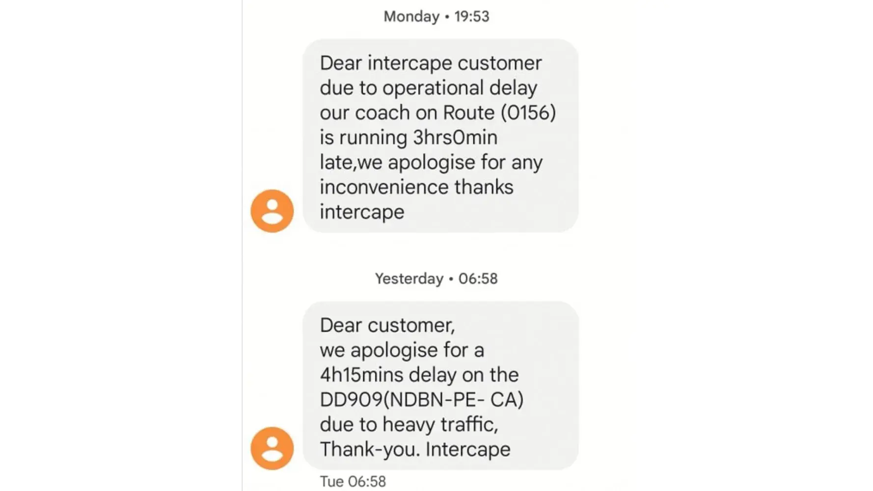 I booked a ticket for the 12th February 2022 from Swellendam to Belville due to arrive at 6 am as i wanted to get to the airport in time for my flight to Durban. Only in the evening of the 11th i was notified that the bus was going to be 3 hours late meaning i was going to miss my flight (financial complications). I tried to adjust the ticket which took me more than an hour and adjusted with R 390.00. While at the bus pick up point later on i was notified that the bus would be 6 hours late again. I had to rent a car to Cape Town and had already missed my flight.