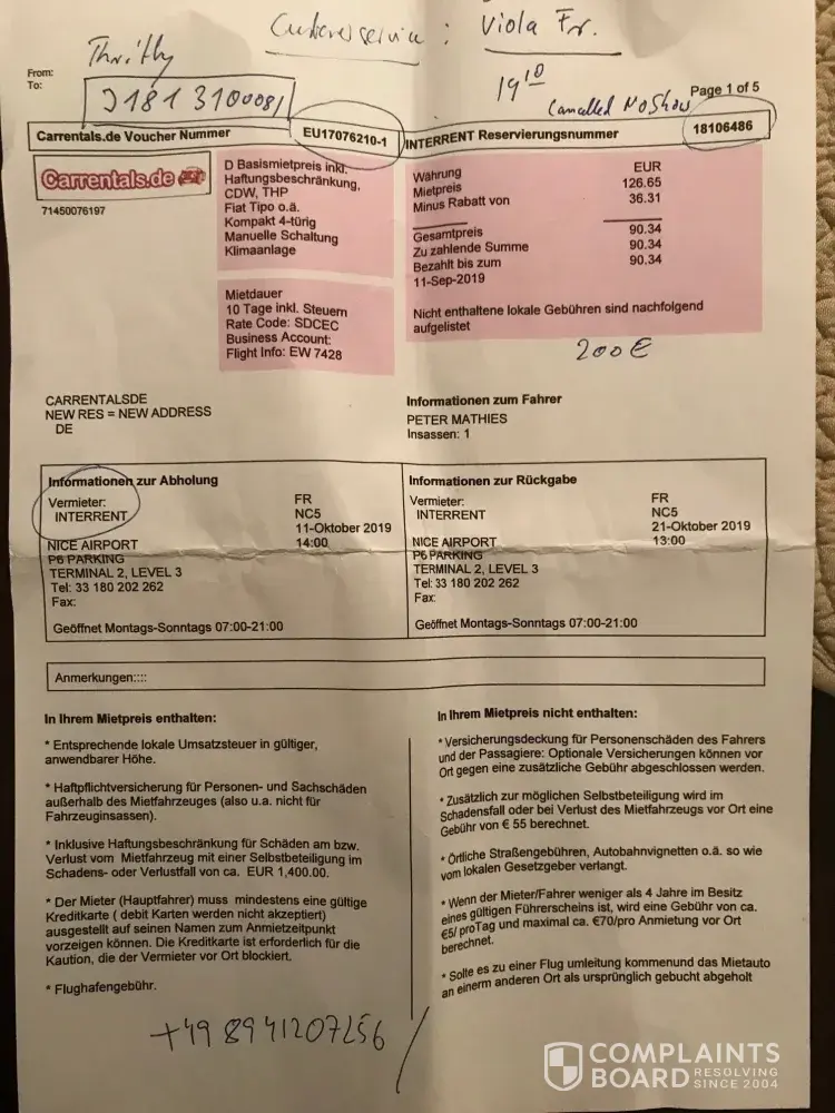 Meine Frau (M Mathies) und ich flogen am 11.10.2019 von HH nach Nizza mit Eurowings EW7428. Unterwegs gab es einen Notfall und die Maschine musste in Stuttgart notlanden.. Weiterflug nach Nizza war dann um ca 17.00 Uhr und Ankunft um etwa 18.40. Ich rief daher bei Interrent an, um mitzuteilen, dass unser Flug verspätet ist damit die Buchung bestehen bleibt. (siehe Anlage) Nach Ankunft in Nizza gegen 18.30 war unser Mietwagen annuliert (no/late show..)! trotz Anruf meinerseits, dass wir verspätet sind! Die Buchung und Vorrauszahlung von 90, 34€ waren weg (Zahlung an Carrentals.de - siehe Anlage) UND wir mussten einen neuen Wagen mieten für 250€. Verlust insgesamt 250€.