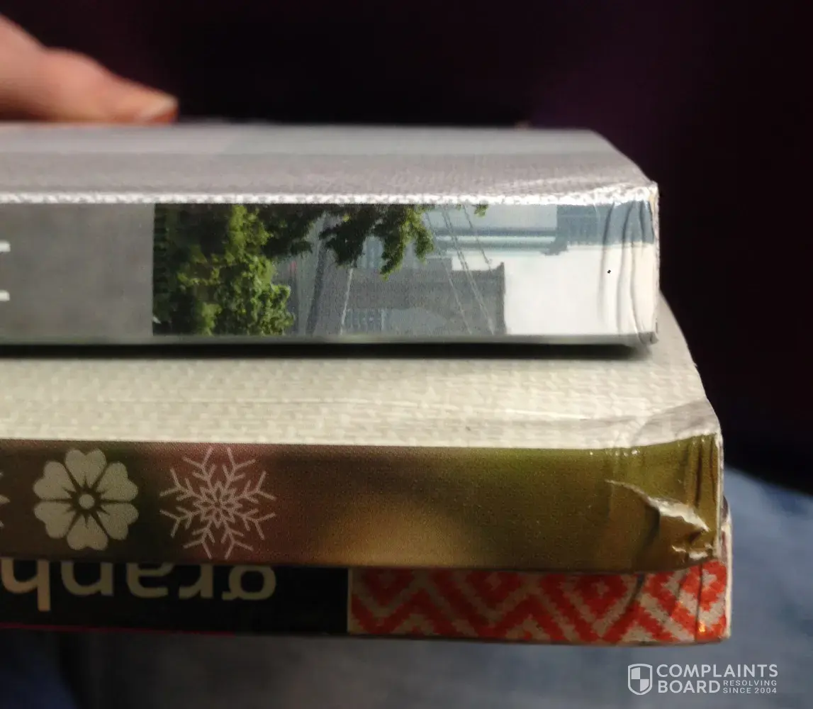 As soon as the package I ordered from Interweave arrived I quickly opened it to retrieve my three new, never-before-used books. However, I was very upset and disappointed to see that they were not the flawless and brand new books I had expected. All three of them had been damaged at the upper left corner with varying degrees of severity. The cardboard box they came in was quite intact but must have been handled badly enough to bash up the books inside. I would like a replacement, however I know that if I pay the shipping to return the products and the new shipping for an exchange, the overall price would nullify what I used to purchased the books. So alas I will have to keep the damaged books. If I wanted damaged books I could have gone many of other places to do business, but I wanted new books of my very own, I luxury I rarely ever have. I would like to see Interweave wrap their products in some sort of protective packaging so that what their customers receive accurately reflects the quality I know Intereweave has.