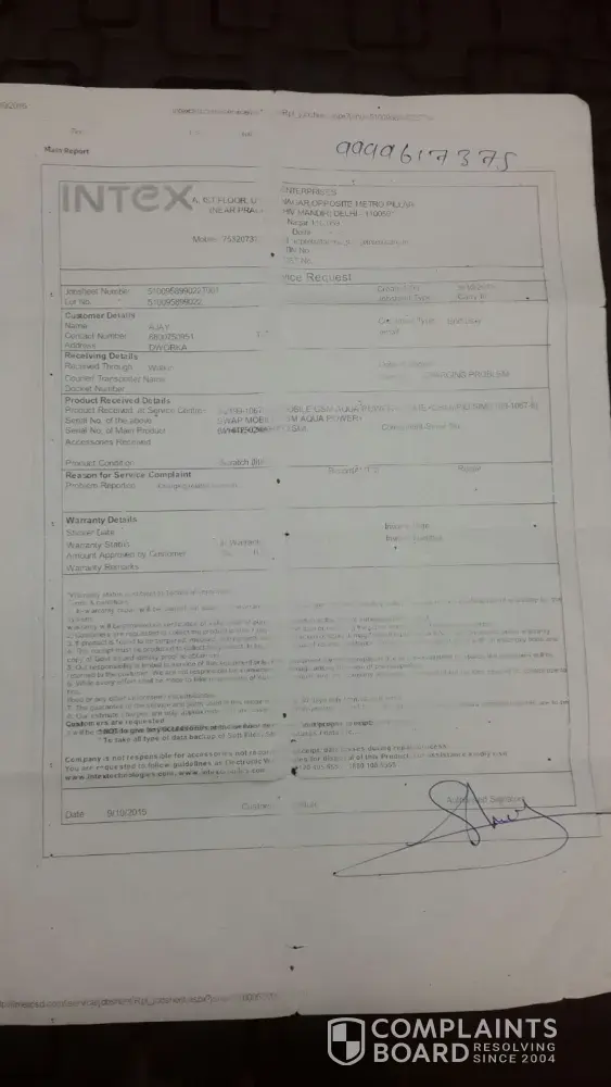 Jobsheet no. is 510095899022T001 Lot No. [protected] My name Ajay I submitted my intex aqua power plus mobile on 9 oct 2015 in Uttam Nagar Intex Service Centre B S Enterprises, it was giving charging prob they said it will take 7 days to repair but now its has been more than 3 months i went there 8 times and now uttam nagar service centre is closed from last 45 days manager said he will give me my mobile at uttam ngr metro station it has been replaced and i will get new mobile as it was not repairable but they said this on 23rd nov and now its has been more than a month they not picking fon and if they pick the fon alwayz say wait for 5 days and now they not picking my phone. Customer care says they dont have any knowledge about my phone i have to contact manager only now now what i should i do intex has a third class customer care i have there many times. m living without my fon from 3 months intex is responsible for this problem..still no solution still they saying to wait..now what should i do..i want intex to pay my all losses and sufferring due to their poor service. I want a strict reaction and a strong case on them i have all cal records also...