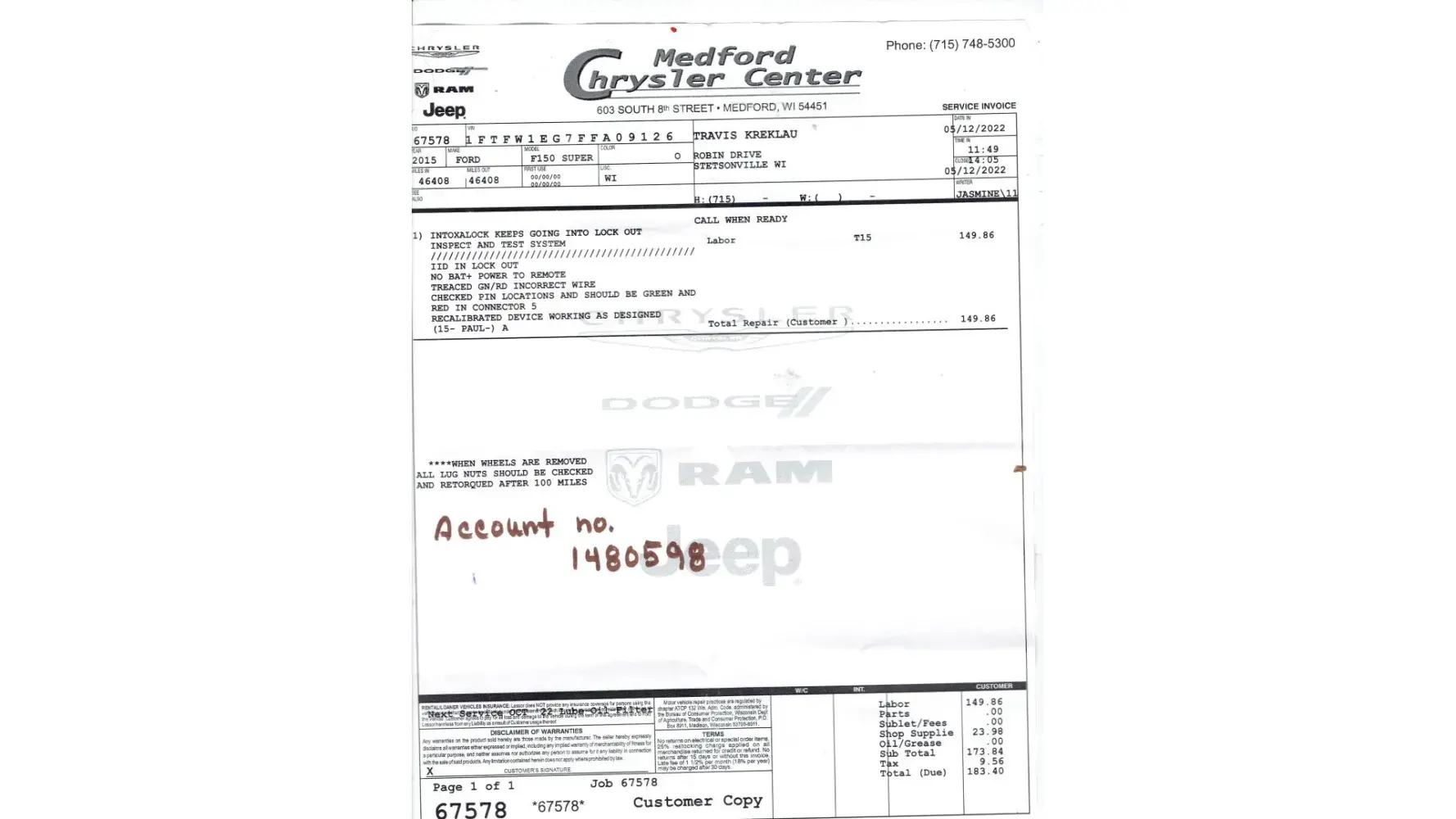 Desired outcome: I want the full installation fee back and a for the service done a Medford Chrysler and the Check be sent directly to Lori Kreklau W3069 Pine Av Stetsonville for my out of pocket expenses