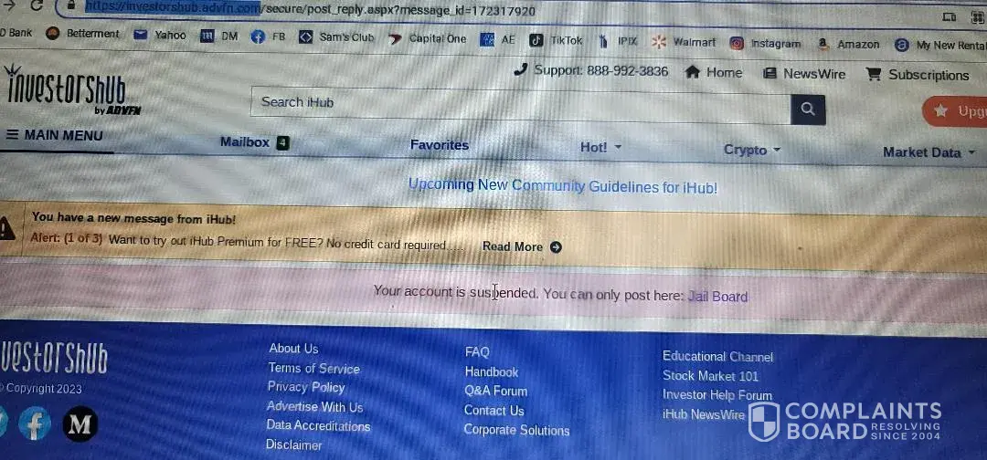 Read full complaintInvestorsHub by ADVFN - Account suspended