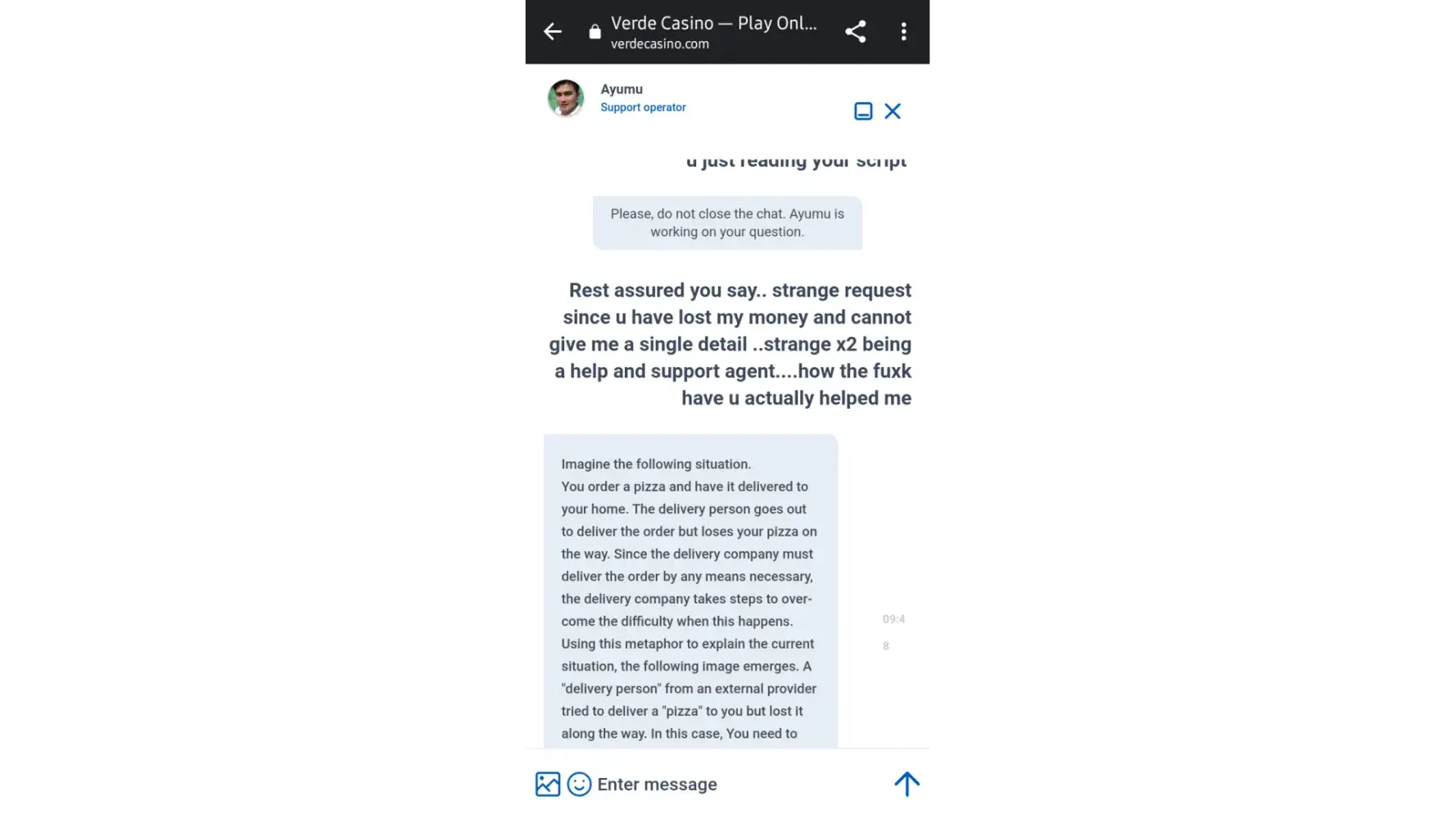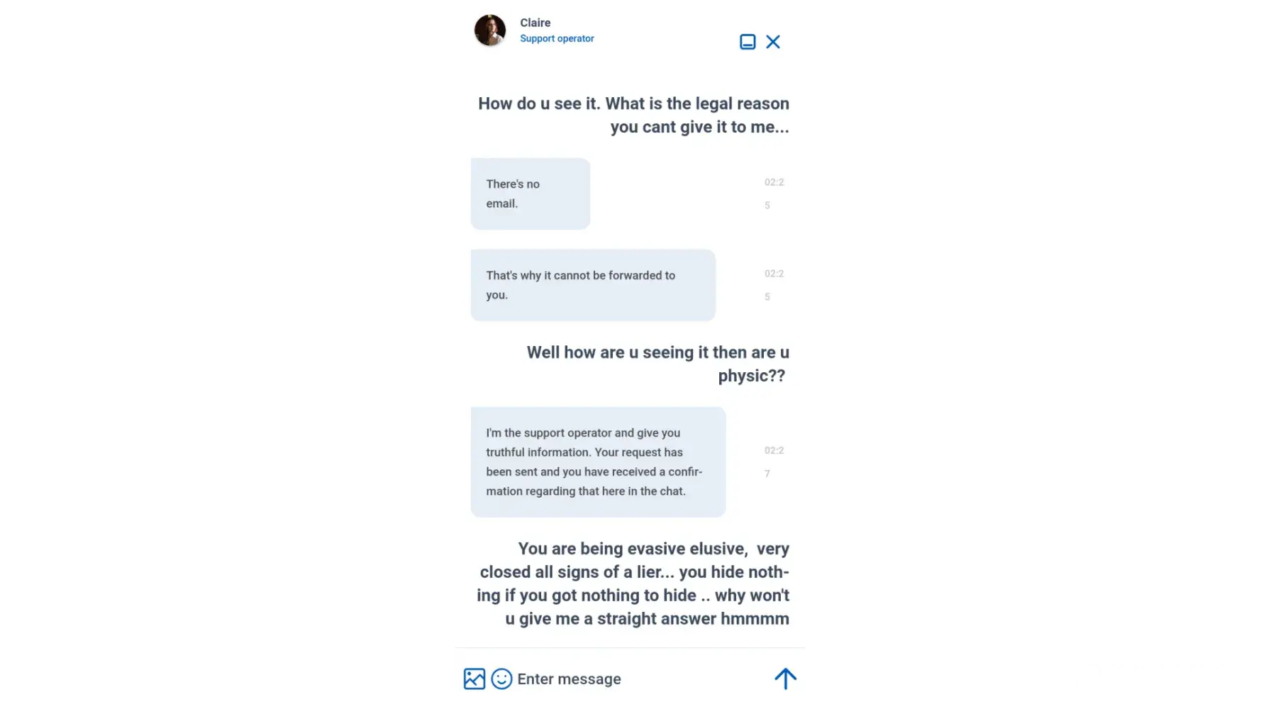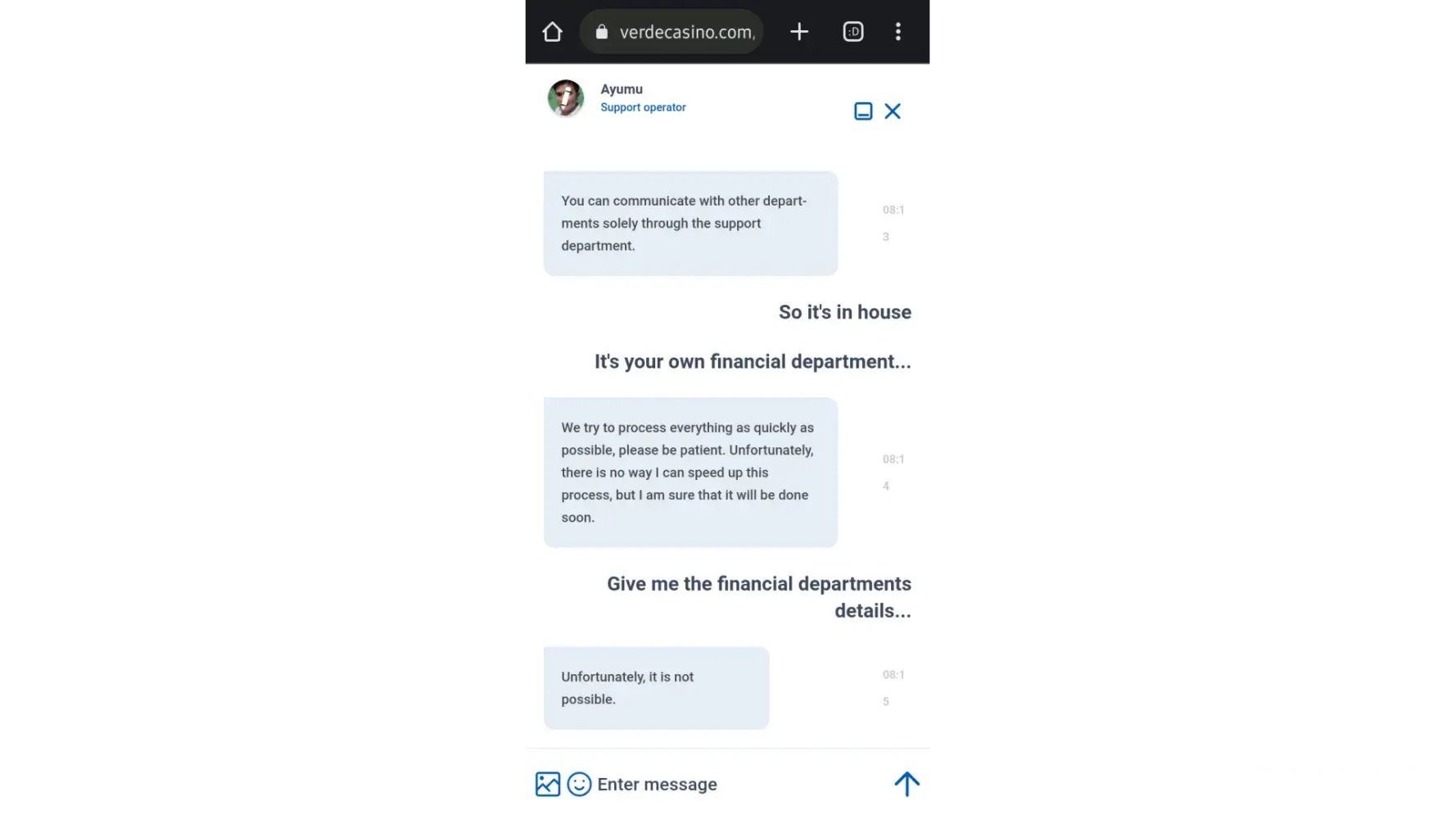 Then claimed they dont have ther details yet other times they have been contacted and I need to wait... They say they can see my complaint has been forwarded to financial department then say they dont have any contact details for them?*must still be using pigeons to communicate) so how was it forwarded and what is it they mean "they can see its been forwarded if not a email... Also that its not ther financial department they have so many different providers that they dont know what's happend whos got it or where the $ is. Once or twice the reason to why I havent been paid was that there aren certain difficulties and situations that can hold my payments up but cant tell me what they are.. What my 13 +days (and counting) of screen[censored]s really expose is a very surface level very generic smooth over umbrella type"answer to all concerns a "dont worry we on the case typed answer however when question the cannot prove any facts or details on how they are helping or who is assisting them... They cannot provide me with a order number statement number invoice or anything regarding my withdrawal and bank transfer.. Ive even asked if they could send back to me my details I gave them to check for any typos I may have given but cant even do that. (again sorry to state the obvious but if they dont have my bank details how are they going to deposit.