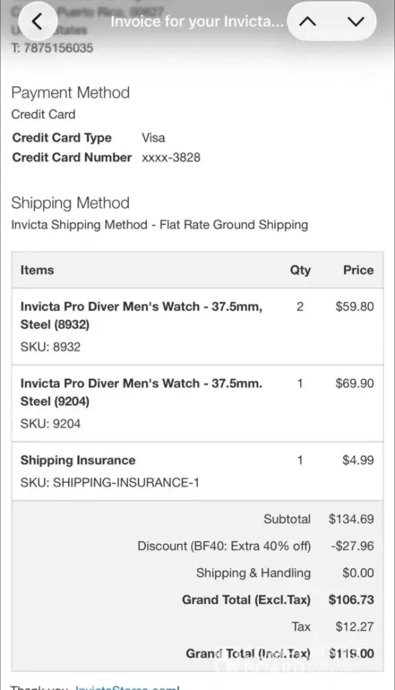 We found clear and detailed contact information for Invicta. The company provides a physical address, 2 phone numbers, and 2 emails, as well as 2 social media accounts. This demonstrates a commitment to customer service and transparency, which is a positive sign for building trust with customers.
