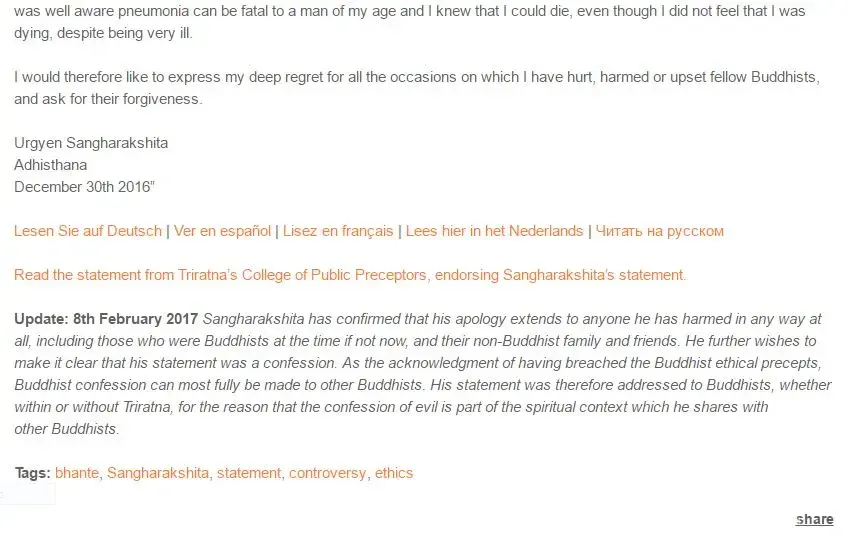 Sangharak[censored]a has confirmed that his apology extends to anyone he has harmed in any way at all, including those who were Buddhists at the time if not now, and their non-Buddhist family and friends. He further wishes to make it clear that his statement was a confession. As the acknowledgment of having breached the Buddhist ethical precepts, Buddhist confession can most fully be made to other Buddhists. His statement was therefore addressed to Buddhists, whether within or without Triratna, for the reason that the confession of evil is part of the spiritual context which he shares with other Buddhists.
