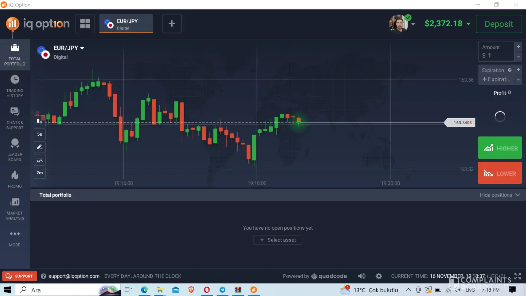 I am registering compliant here because iq option email support not replying from last one week I am sending mail daily but no reply from there and chat support also not working my compliant is below please send to iq option.↓