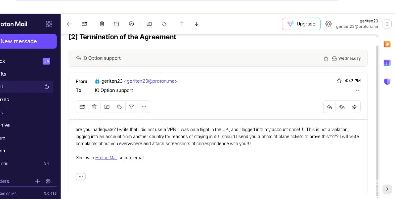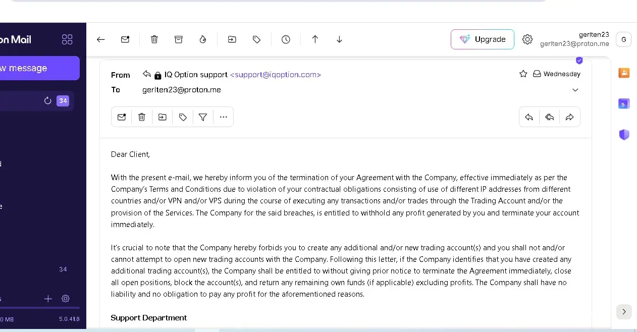 Hello, iq option sent me a letter that they will block my account and deprive me of the profit that I received. allegedly because I used VPN. but I haven’t used VPN, I don’t even know how to use it. I once went on a trip to Europe before the auction and came home. traded from a home entrepreneur. I ask you to help me return profits from the platform, they refuse to withdraw my money