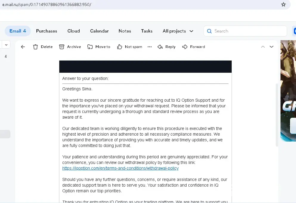 hello, my iq option account has been under additional verification for 34 days, they are not withdrawing money to me, I write to them by email every day, but they don’t tell me when the verification will end. refuse to withdraw $1650