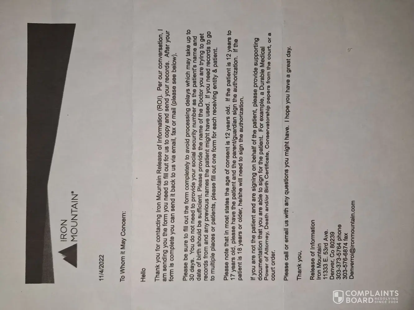 4) I then complained to both our local complaints website HelloPeter and the UK Iron Mountain company, and only then received the requested information.