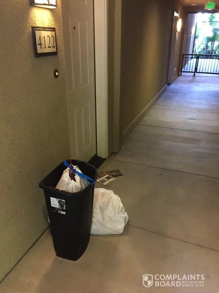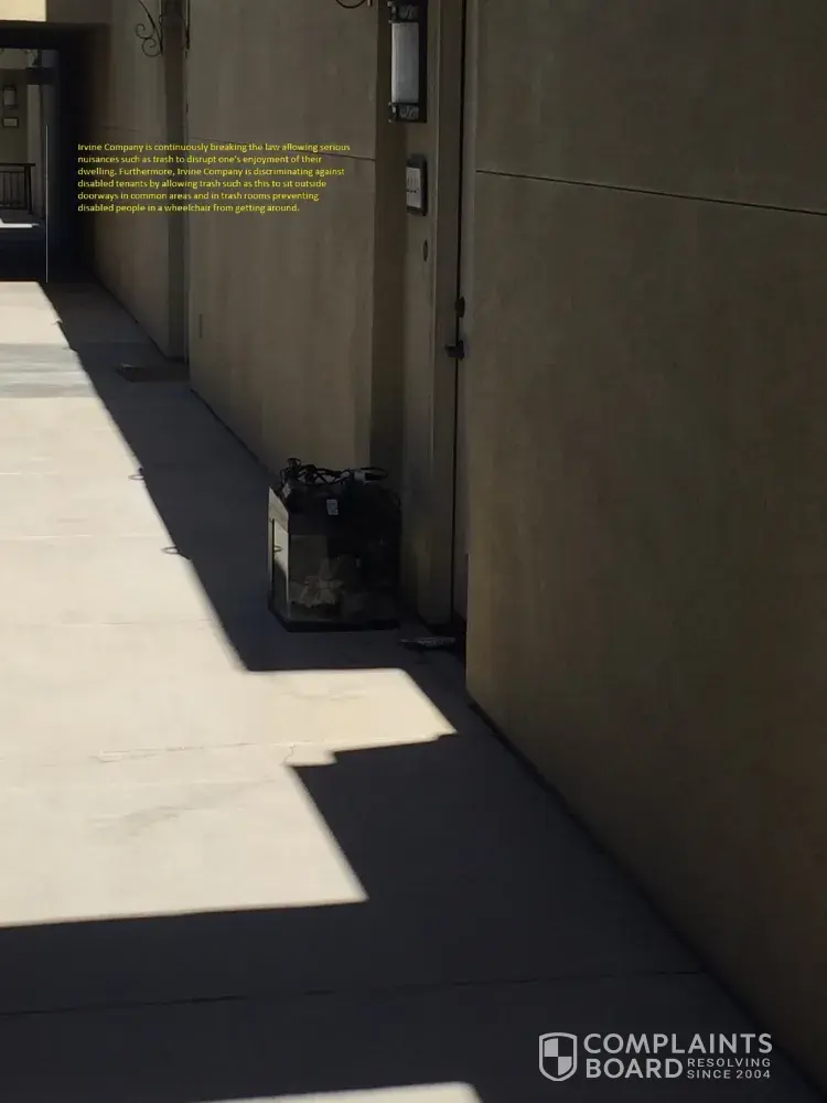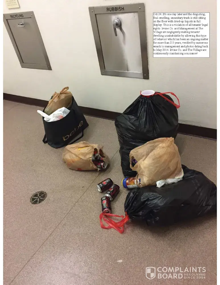 Either way, Irvine Co. and management has a legal obligation to make certain the property/dwelling is kept in every part clean, sanitary and free from all accumulation of debris, filth, rubbish, garbage, rodent and vermin pursuant to Civil Code Section 1941.1(a)(6). What's their reason for allowing trash to sit outside apartments for more than a day and even longer than a week?