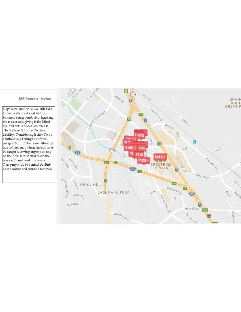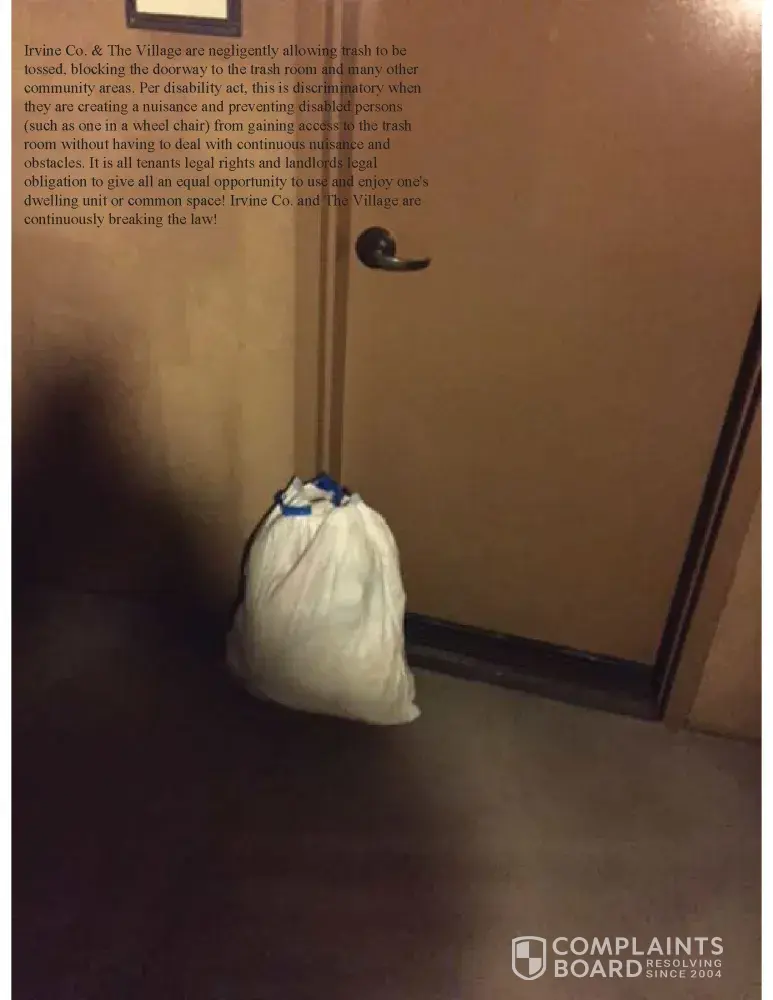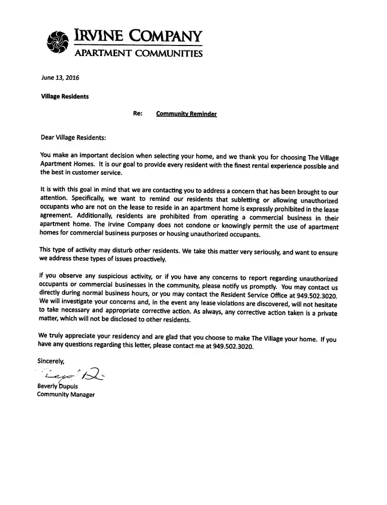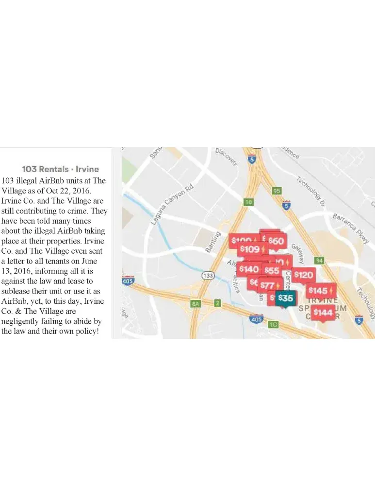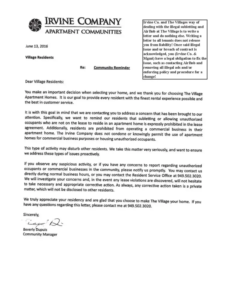 Irvine Company and management are constantly maintaining a nuisance at The Village. They are continuously failing to enforce paragraph 13 of the lease by allowing the illegal AirBnb business to be conducted at the property. They have been informed of this matter numerous times and negligently give it the blind eye and deaf ear. The only thing Irvine Company did was send a sugarcoated generic letter to all tenants at The Village dated June 13, 2016, informing them how it's a violation of the lease to sublease their unit (aka running an AirBnb business).