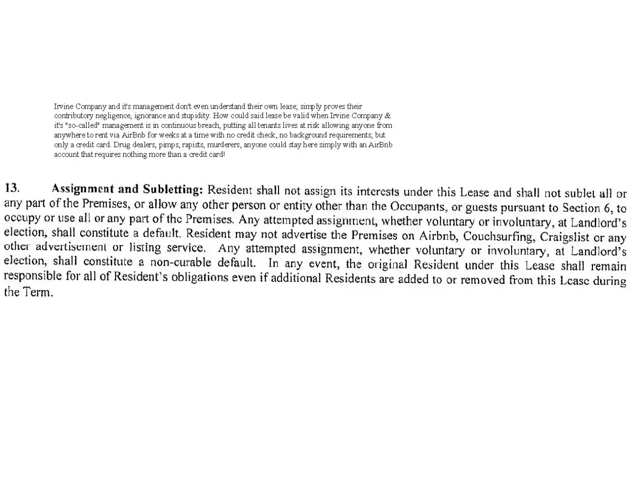 Paragraph 13 of the lease specifically states (photo also included with their Yelp profile...approximately page 2 of the photos) it is a violation of the lease for any tenant to "advertise the Premises on AirBnb, Couchsurfing, Craigslist, or any other advertisement or listing service". Furthermore, aside from paragraph 13 of said lease, it is a violation of the Irvine Municipal Code to operate an establishment allowing transient occupancy without obtaining a transient occupancy registration certificate from the City's Manager of Fiscal Services, and without paying the corresponding transient occupancy tax.