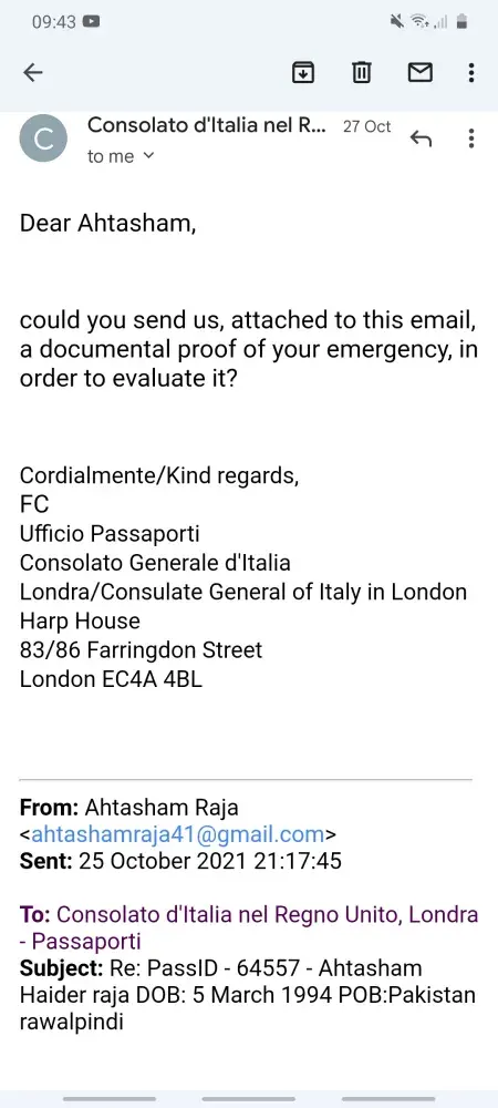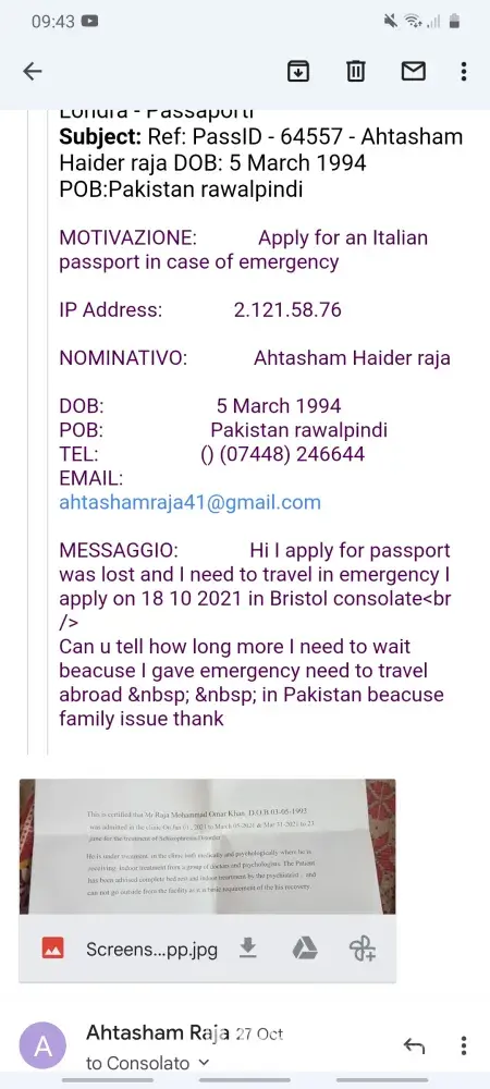 Hi I went to Bristol consolate 18 10 2021 to apply new passport and I apply urgent passport I pay fee extra and signor luigi his u will get passport in week then I send a email to him his didnt replay to me and I send loud of tex in wats up then his reply.