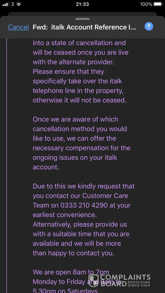 Towards near the end of this contract with italk which I cancelled many times as you can see reading my saved emails sent to italk, my complaints which again I were lied to, telling me in an email that they are sorry for all of their shenanigans and failures as a company and can, and will compensate me in offer of compensation they wish to discuss with me and want me to call on the number they provided, and after calling and speaking to someone apparently from the management team at italk and they just blagged me and told me they were unaware of any offer, or any emails between italk and myself so another time wasted event stunt by italk so to speak.