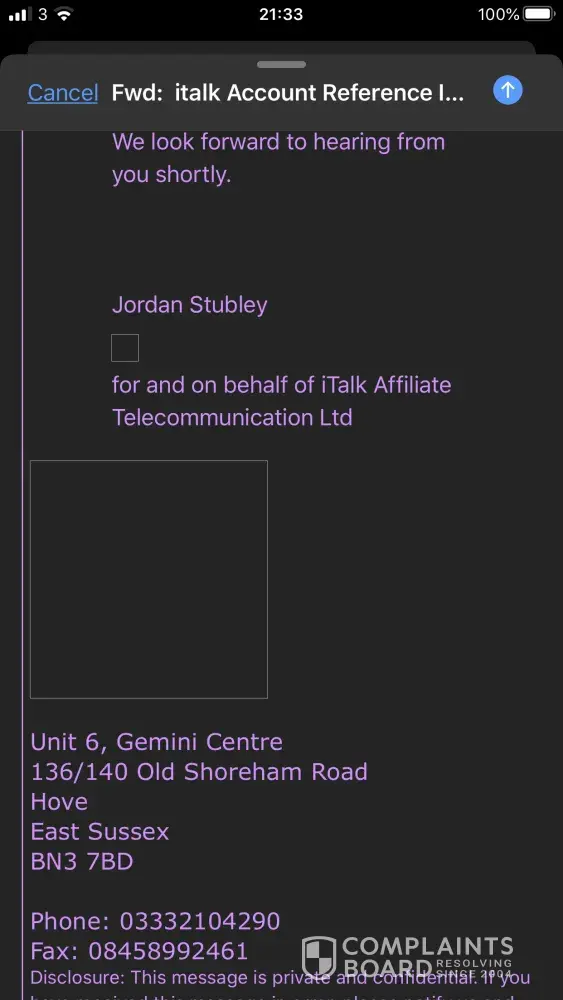I have saved and are in safe keeping over 100 corresponding emails between myself and a number of people who work (or did work) at italk telecommunications LTD who either I were in dialog with at that time, or just the random inbetweeners who used to annoy the hell out of me and would carry on harassing me when my account supposed to be on hold but were also just more lies, monthly bills, general emails just to cause me more grief with an aim (or so it seems), to break me mentally through worry and court, bailiffs calls, etc etc. I managed to keep over 20 letters sent to my home address, some threatening some not but still amiss, and over two dozen speed test results during the time of my complaint and before shutting my phone line and internet down/off and still billing me.