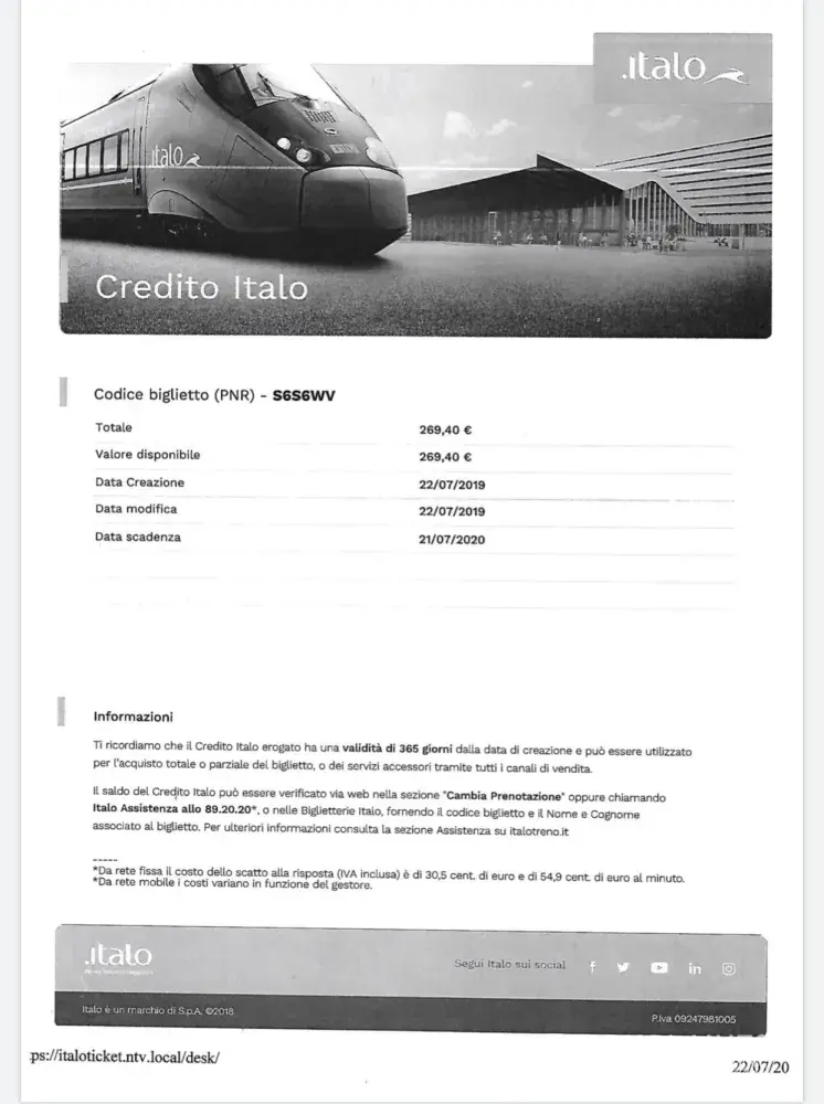 My family had a passage Rome-Firenze and Firenze-Rome both at 22/07/2019 cancelled by technical problems in Firenze Station. The Italo Office at Termini Station in Rome gave us a credit in total of 269, 40 euros according to the document annexed at this email. They gave us all the information to ask for the money back as soon as we returned to Brazil.