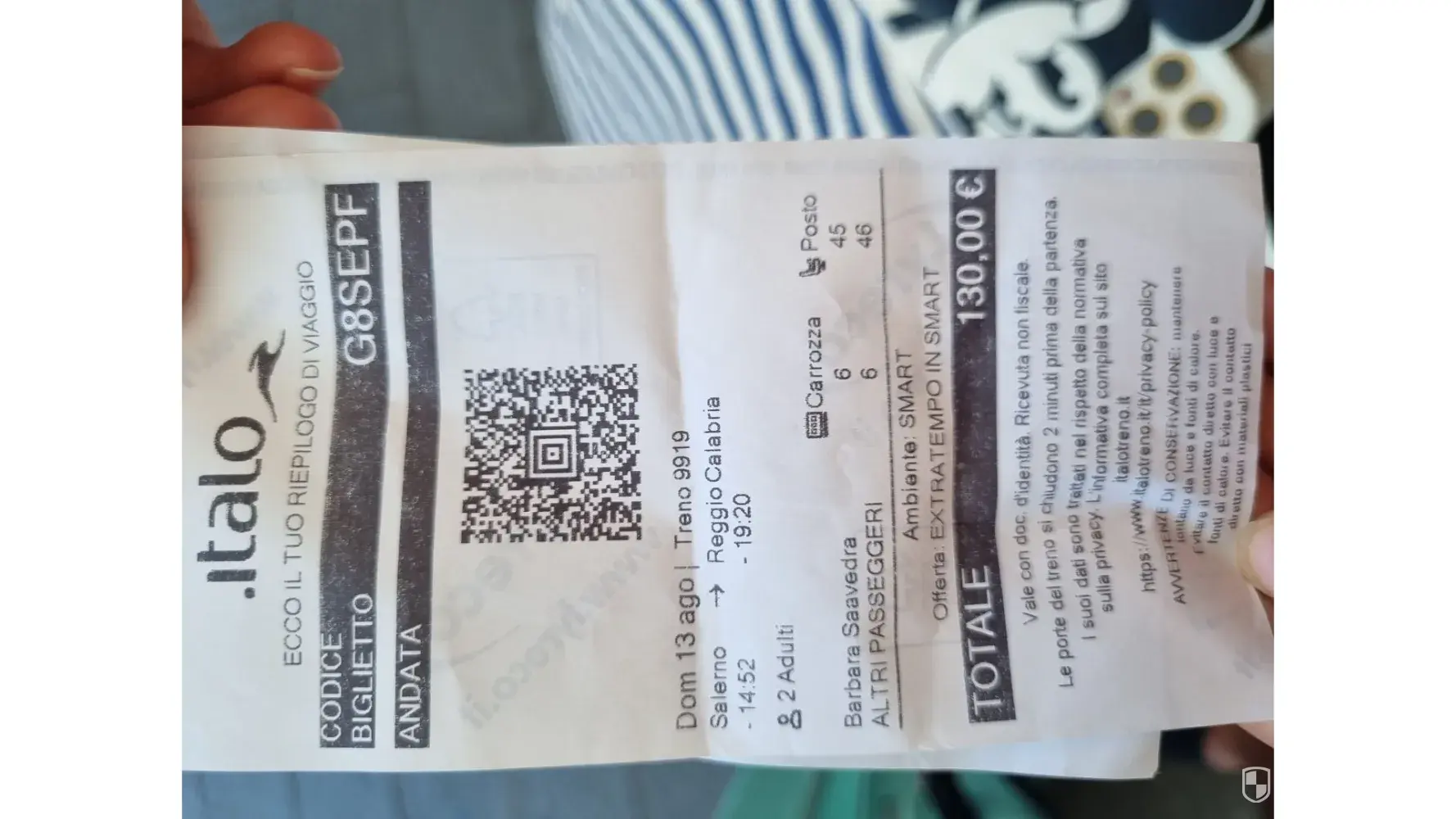 I had a ticket for Calabria at 12:45 from Salerno. The train arrived at 12:45 at the station and left 2 minutes after the arrival.