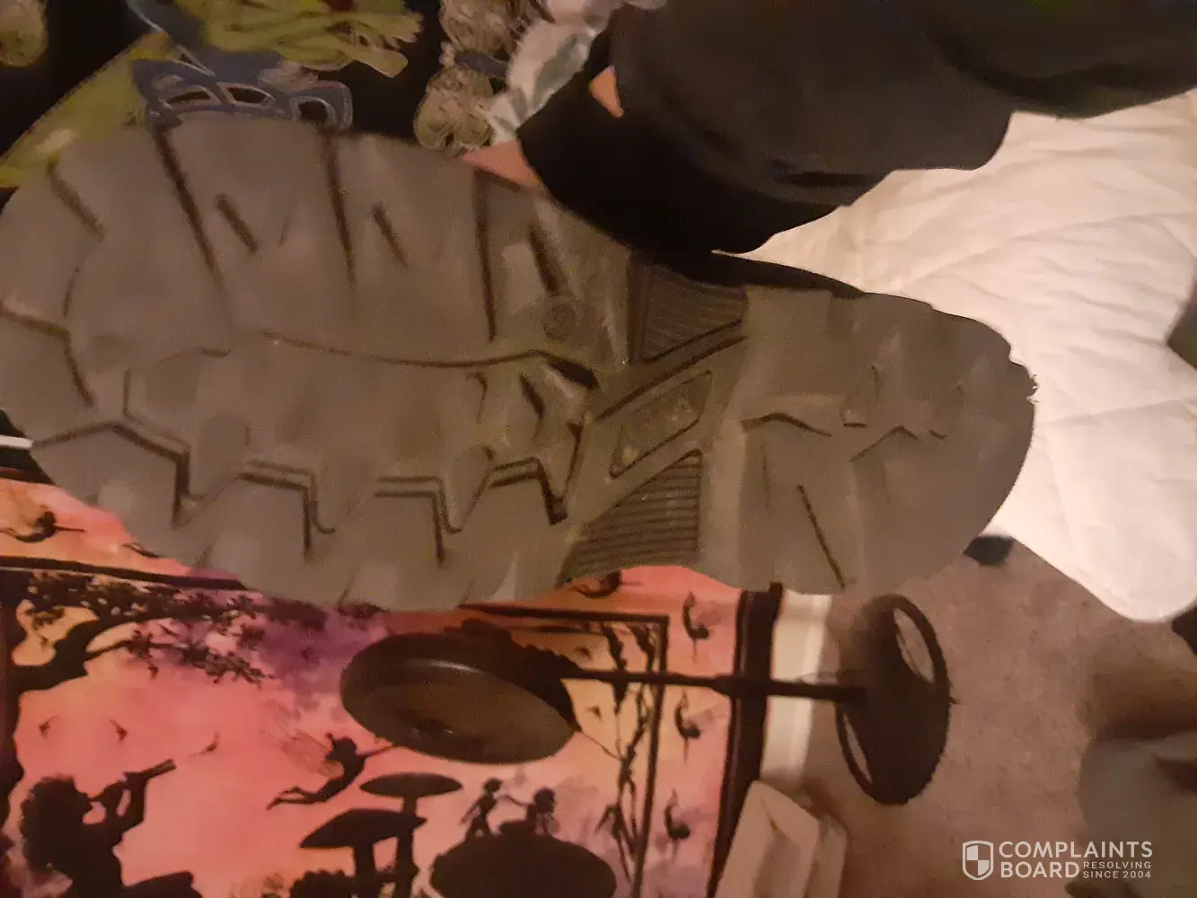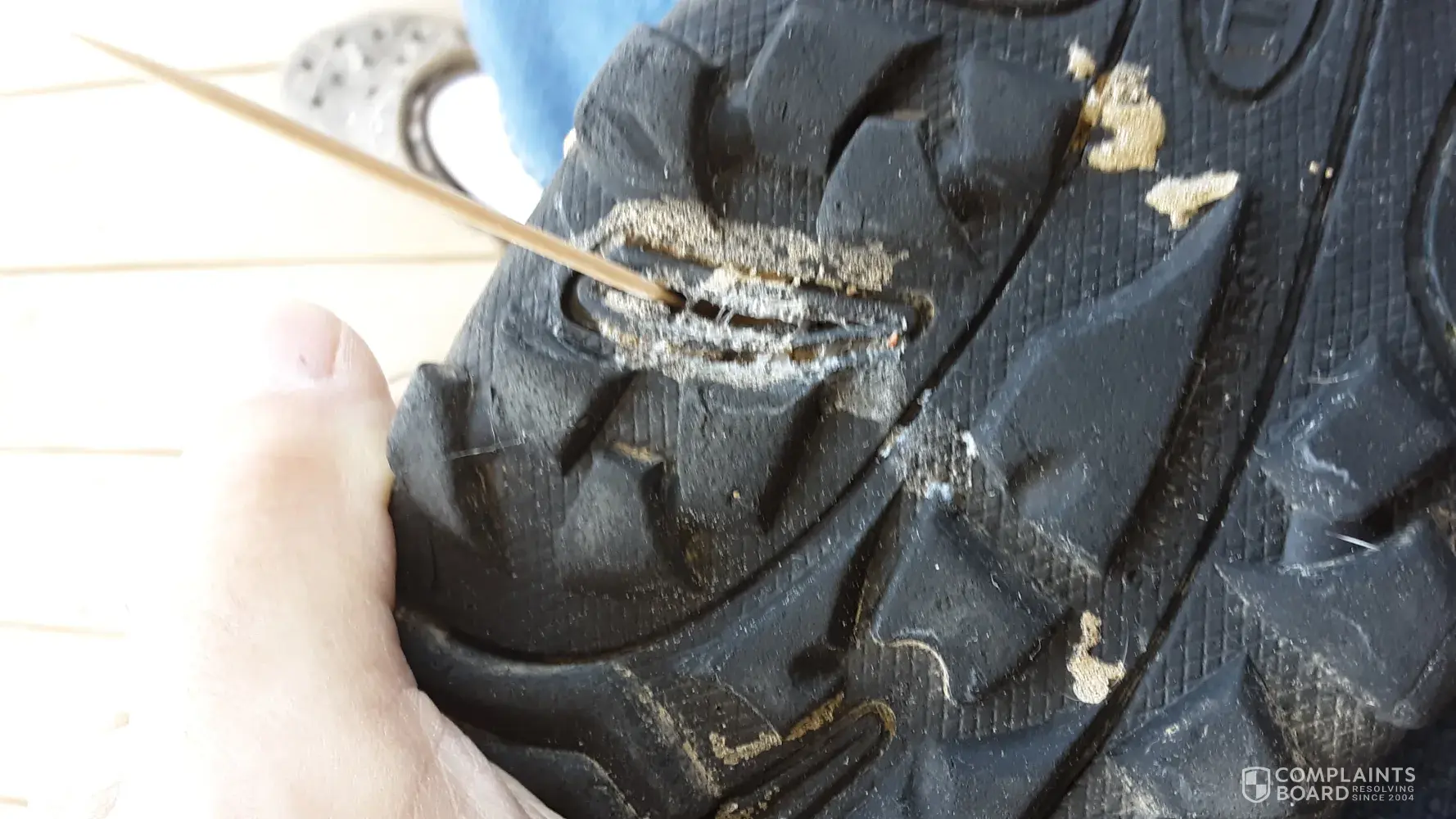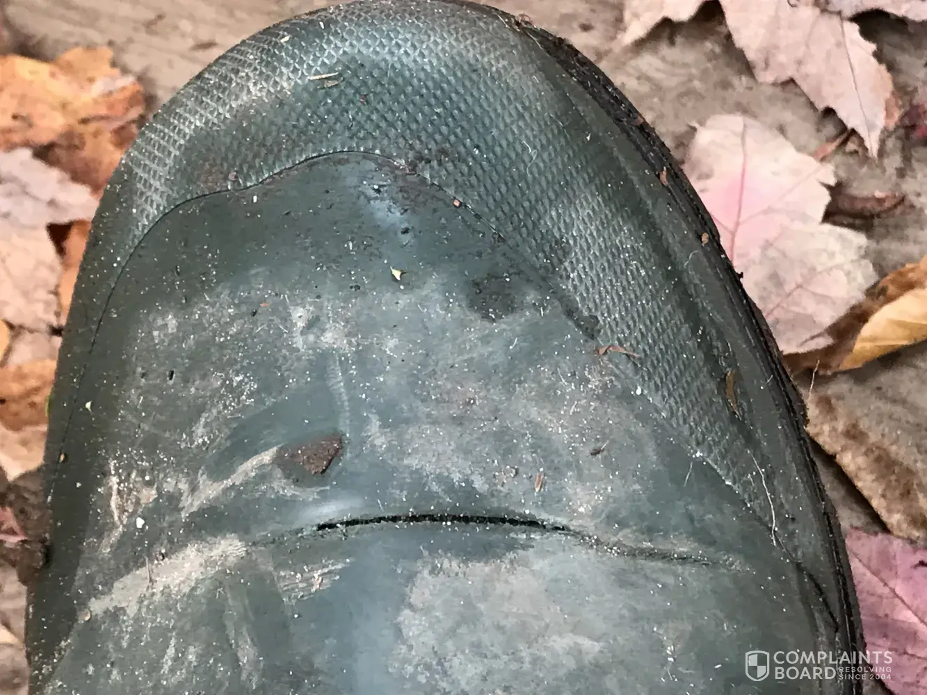 The next time I went to get the boots, they had fallen apart. I can assure you that this was not done by wear and tear but by a defect in the boot material as shown by the pictures I have attached.