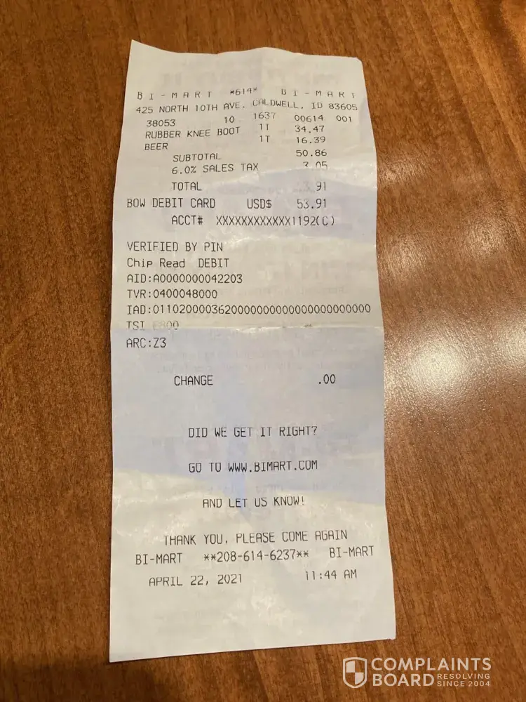 April 22, 2021 bought a pair of rubber knee boots Bi Mart store number 614