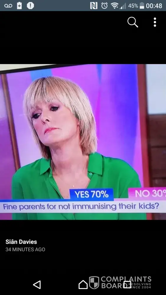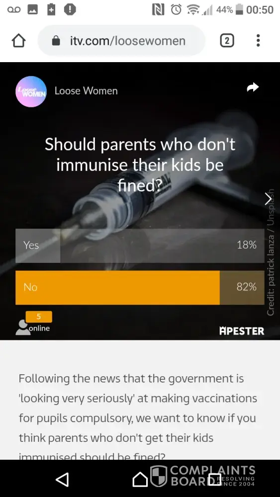 I am complaining as yesterday during the vaccine debate on the loose women show, had shown a fake poll . On the itv website the poll for parents agreeing to fine parents for not vaccinating were 82 percent for no . The show had aired the poll the opposite way round. This is misleading the viewers and sharing false information. I will not be watching the show again. How can I trust any infornation is crediable from here.