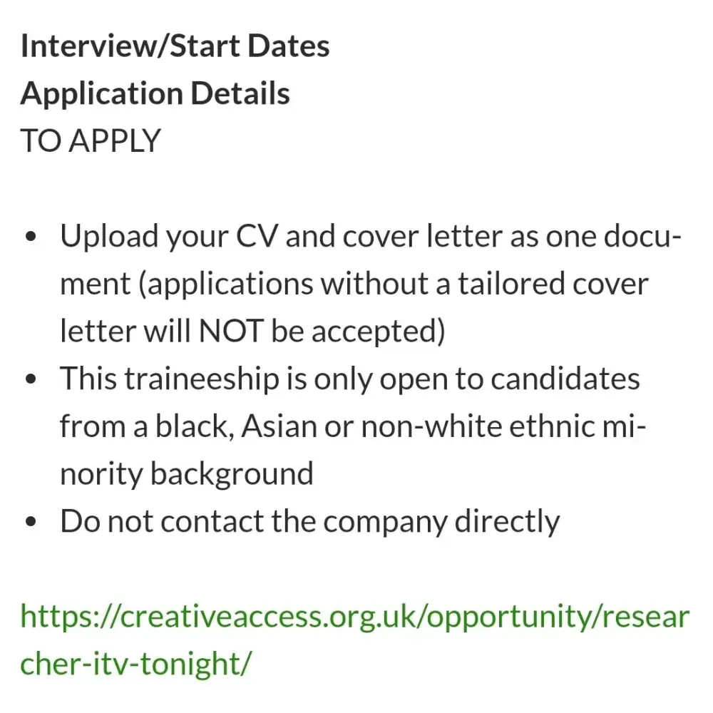 The traineeship is open for blacks Asians any one non-white this is xenophobia you need to remove this advert before I repot it further it's 2018 and racism of any for sould not be tolerated I'm discussed with ITV I will wait for you reply I'll give you 24 hours I refer you to this case for point of law At trial, Boneberger testified that Academy Director informed him that he shouldn't bother applying for the job because it was going to a black female. After Boneberger's employer selected a black female for the position, Boneberger's supervisor told him that the selection was to "bring color down to the Company "