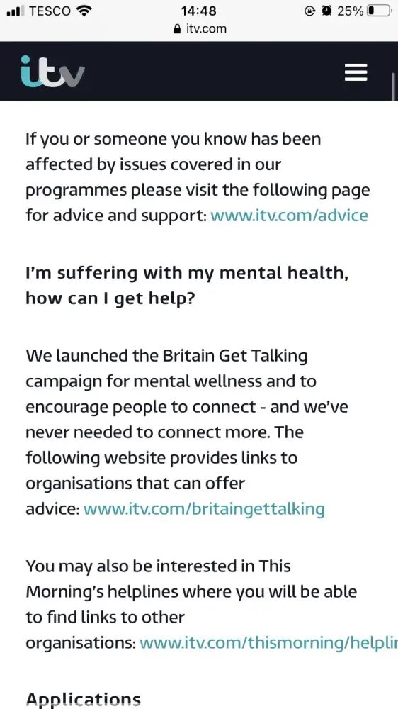 I am absolutely disgusted that ITV continue to employ this man. It is clear that ITV do not care about the mental health of people so do everyone a favour and stop preaching about it. Please stop advertising "Britain get talking" whilst you continue to employ a bully, a man that hacked a dead girls phone, a man that claims a woman is lying when she says she is suicidal. Please remove all mental health support from your websites and adverts because whilst that man is still on the air, you are part of the reason.