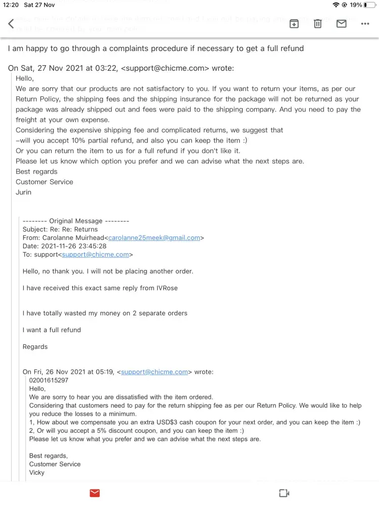 I made a purchase i. August 2021 and unfortunately the clothes didn't fit and I wanted to return them. First of all that they kept offering me to keep the pieces and offered vouchers and lots of discounts for me to keep the items. I said that I wanted to get a refund since it was my right to it.