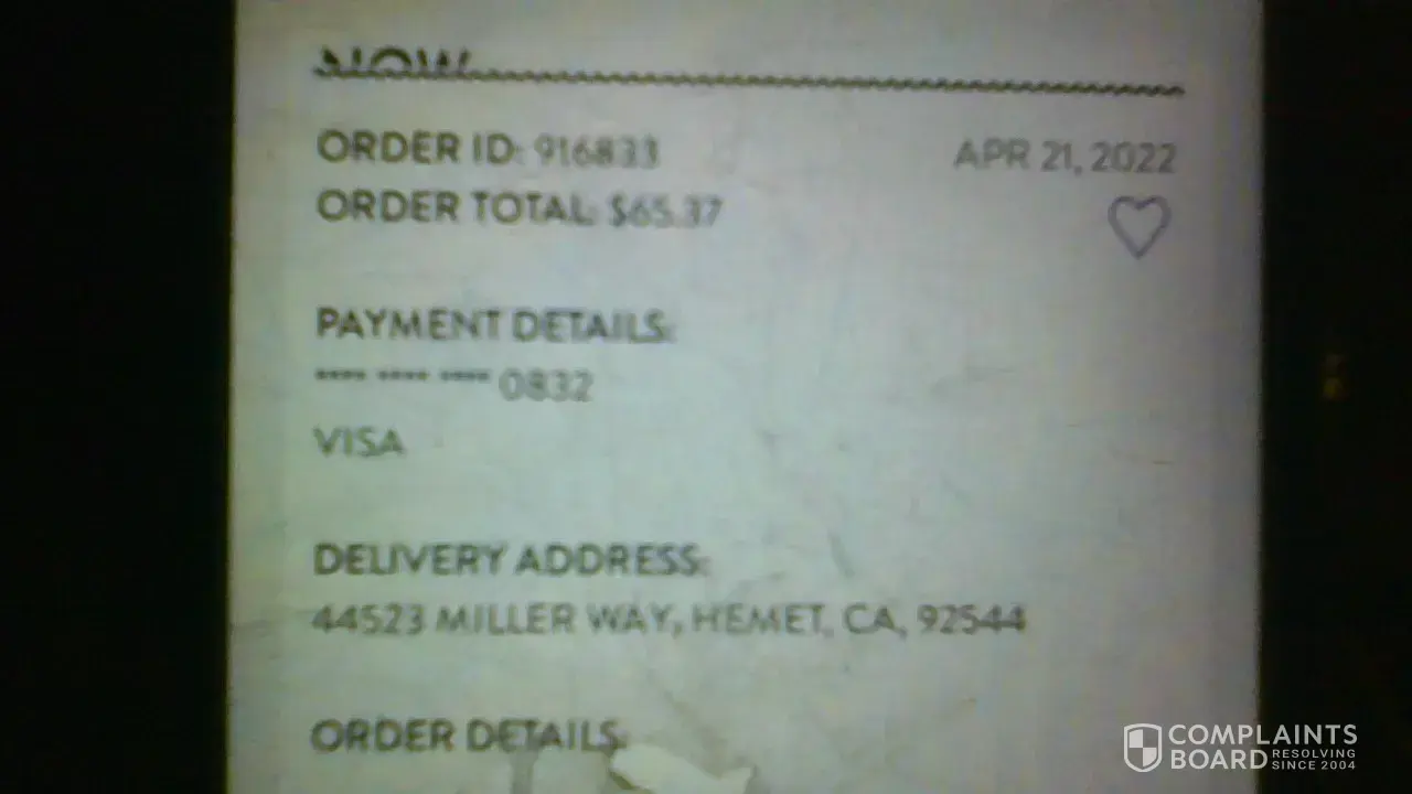 I got charged for my food I never received order number 916833 on april21 2022 for $65.37 delivery addresss 44523 miller way ca 92544 payment number ending in 0832