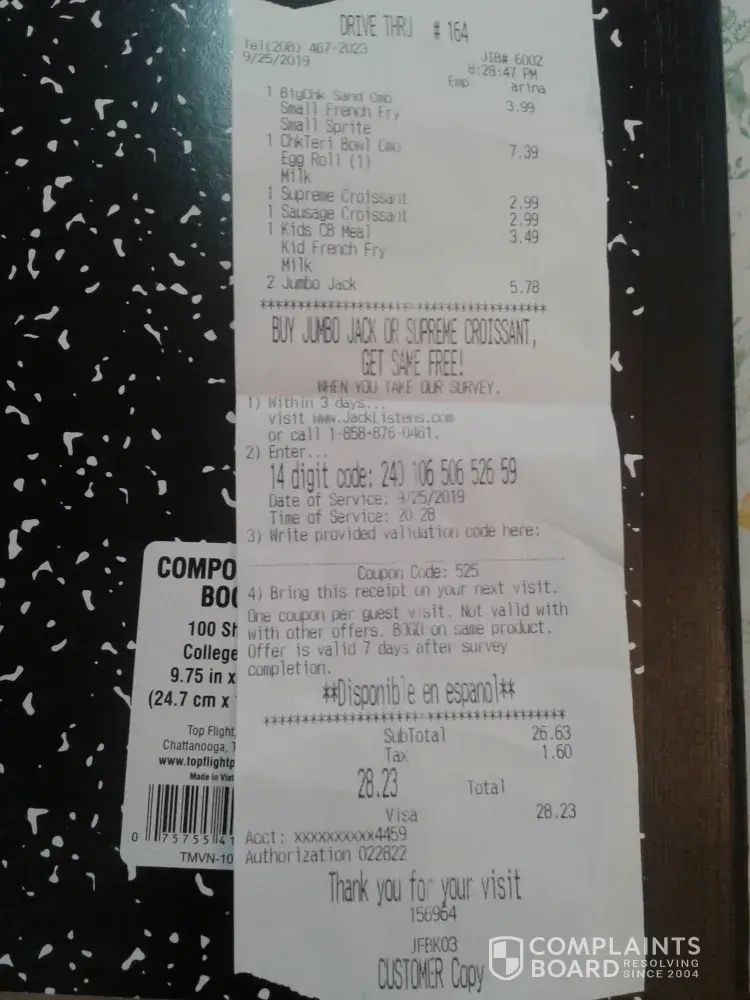 We went to this Jack in the box tonight and asked for $3.99 big chicken sandwich combo. But cashier said they don't sell $3.99, their price is $4.99? I am attached my receipt for you to review. Also the stranger thing is other location they have adds on the window with $3.99 price but this location their add only with pictures but no price on it...