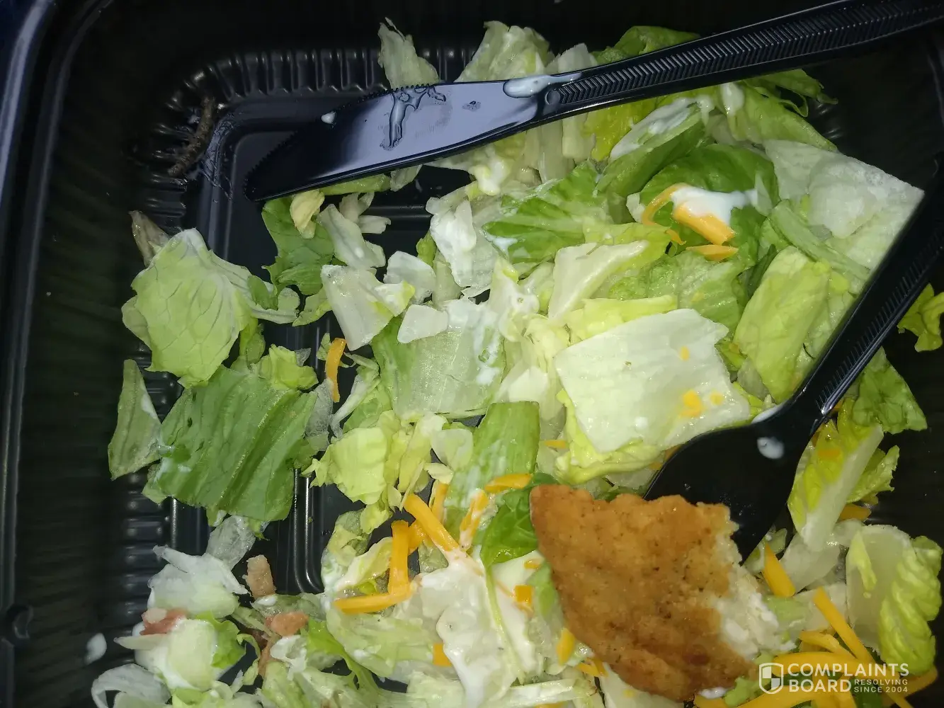 I ordered a crispy chicken salad on Postmates as well as 10piece nugget small Dr Pepper and 2 orders value fries . The salad wasn't crispy chicken it was grilled chicken, once I opened the seal it looked normal until I actually looked at it there was a piece of hair, looked like a pulled pubic hair so discusting I couldn't even eat all my food that turned...