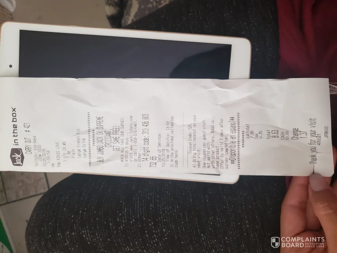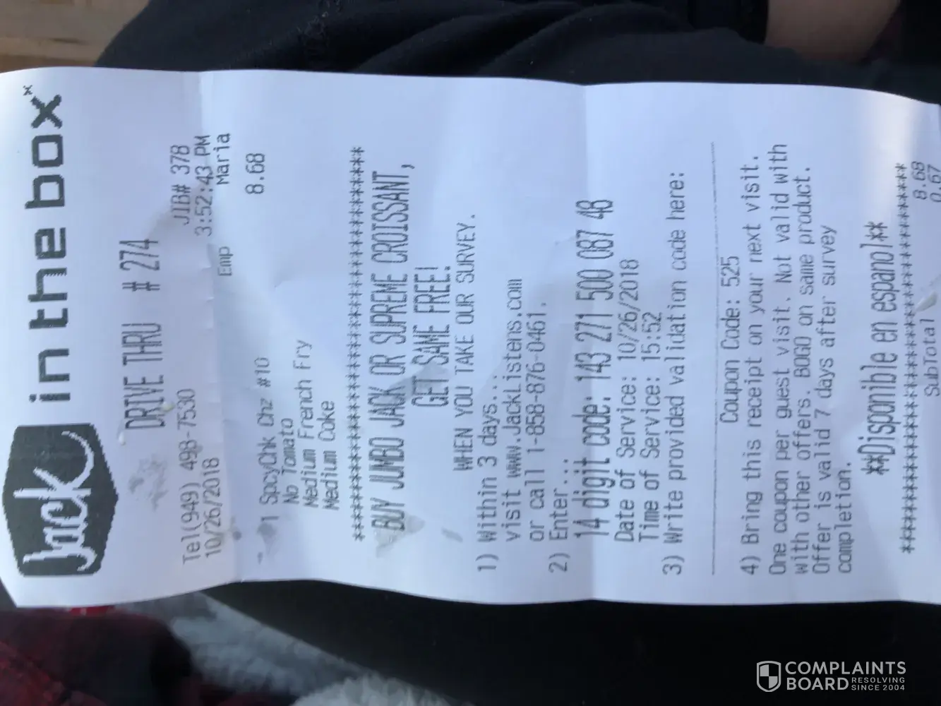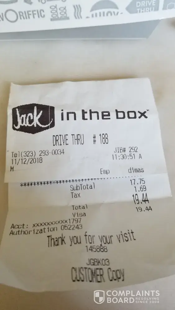 Hi I was just at 56 and pacific tacoma washington state jack in the box 11/16/18 12:10:47 a and order 2 meals with curly fries and an order of jalapeños 163895