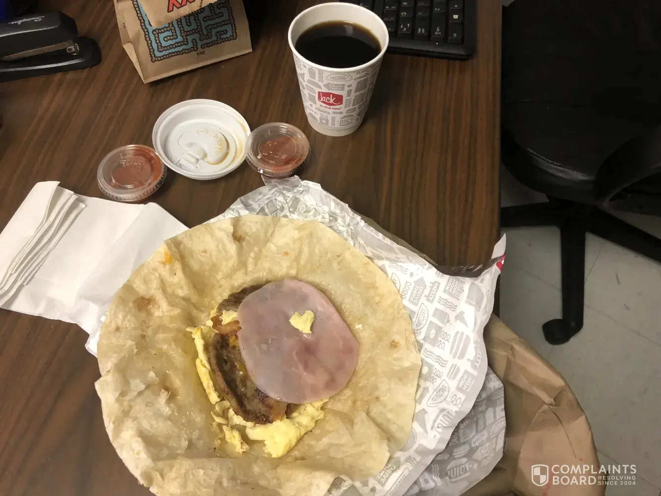 I'll stop by Jack in the box this morning at 49 E. Cross Timbers for breakfast I ordered a supreme burrito when I got the Burrito the eggs wasn't scrambled and it had a sausage and ham laying on top of it it's a shame that you pay your money and can't get the employees to fix the you food right the way. I've add a picture because this is not the way it looks on the sign. Pittyful!