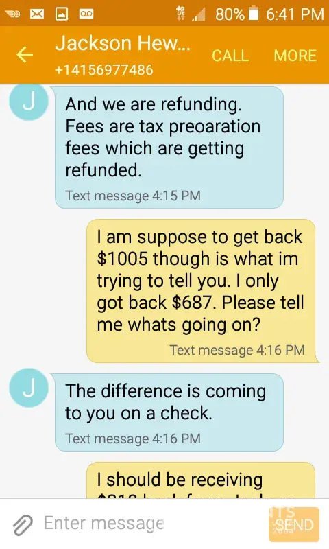 Hi my name is ryan santos. I want you to know that i am very unhappy with the service i been getting from jackson hewwit in suisun city walmart. To start off...My income tax somehow got filed by nick and sent to the irs without my w2, and without my signature & consent causing a major delay with my tax return. Maria @ suisun knew this was going to be no charge because i even heard her boss on the phone telling her that my tax filing is for free. Instead a fee of $318 was taken from my return. This was suppose to be free! Please send me my $318 asap because its not right! I shouldnt have to go through this. Its bad enough jh made an error last year with my return. Its error after error! I even personally spoke to another supervisor from the jh call center and she guaranteed me that they will fix the mistake and do my tax for free at no charge! I was suppose to get $2187 for my return but an offset of $1182 (Which im aware of) was deducted. I only recieved $687 because of jh preparation filing fees. Please send my $318 asap to: 2707 toland dr. Fairfield ca 94534 or face legal actions. If it makes it faster for me to pick it up, i dont have a problem with picking it up.