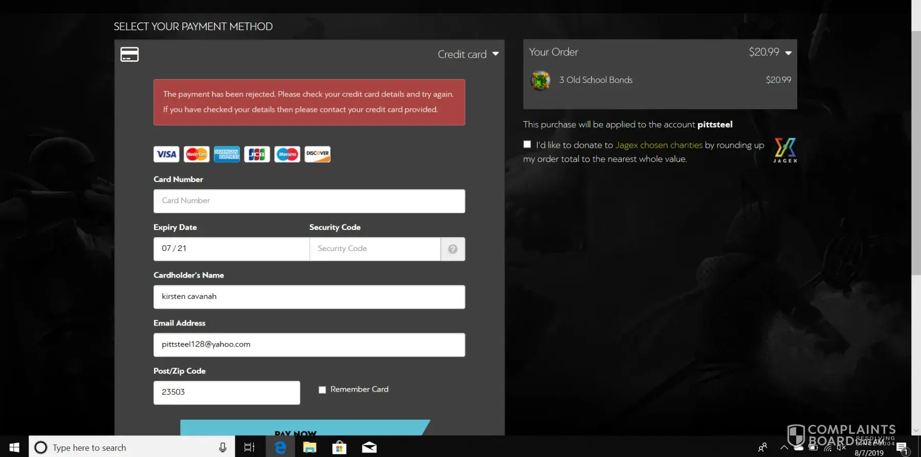 I was attempting to purchase old school bonds, and my card kept getting rejected. Idiotically, I attempted to repurchase a few times, thinking the error was on my part. I was wrong. Jagex has charged my credit card 5 times for 20.99 USD and I have Zero bonds. Refund my cash immediately or I will take legal action. This is my first time playing in at least eight months and I know for a fact that I am not at your "bond limit" or whatever sorry excuse you give other clients. This company is a scam and has no customer service! Thank goodness my credit card company has real people and contact information so that I can settle disputes such as this. I will be seeking counsel to advise me on my pursuit of Jagex and fixing their plentiful errors.