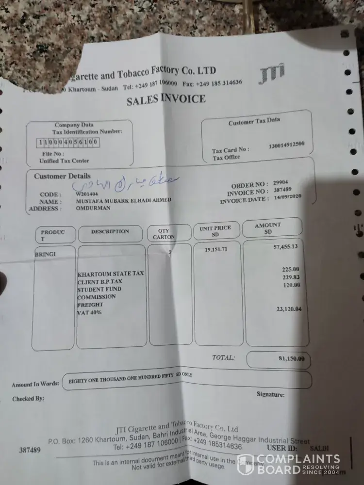 I am the only one on this page whose problem has not been resolved. I do not know what to do or who to contact. I hope that the management of the Japanese Tobacco Company will stand with me in my problem in the Sudan branch. Thank you very much. Just solve this problem and give me my share of Japanese tobacco company products in Sudan. I sent many messages to the company regarding distribution to me in Sudan, but I did not know or find a solution. I am an agent for the company and I have a tax number and a code that I do not know. It has been three years and no one has cared about my problem.