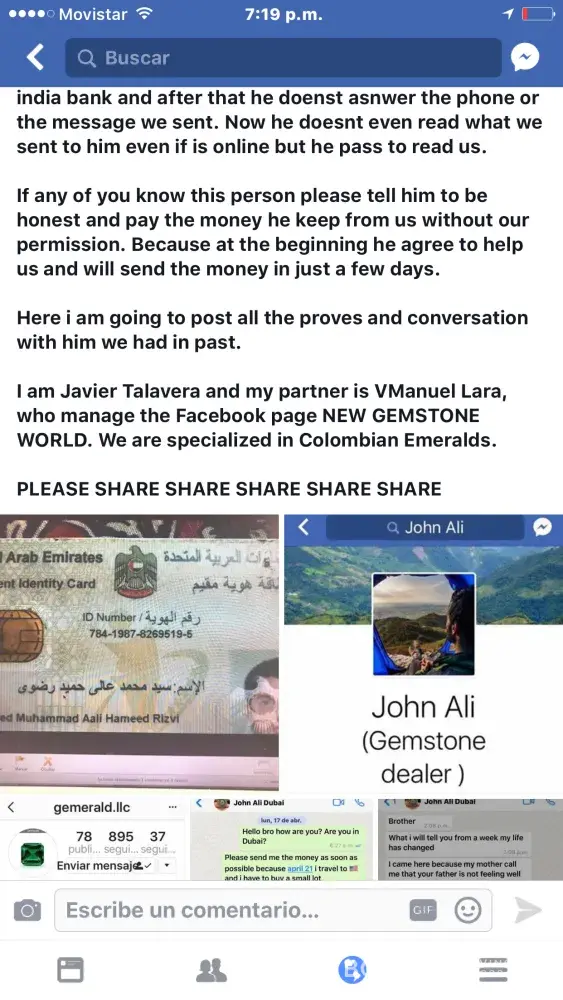 I am Javier Talavera. Last week we reported an scammer on scamologist and blacklist of scammers in gem industry. After we report him on jun 22 he create this story with a fake account with my name on it to create a supposed conversation between me and buyer. I ask to the team of complaintsboard.com to delete this post. No solid evidences, no receipt show of wester union. This is totaly fake.